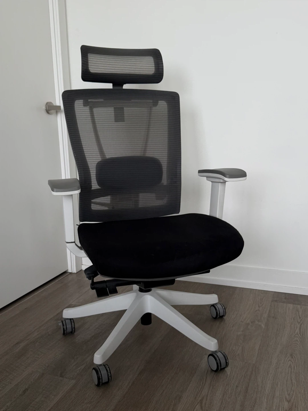 This is an ergonomic mesh office chair with a black seat and adjustable headrest. It features a white base with wheels and a breathable mesh back. Great for long hours of work!