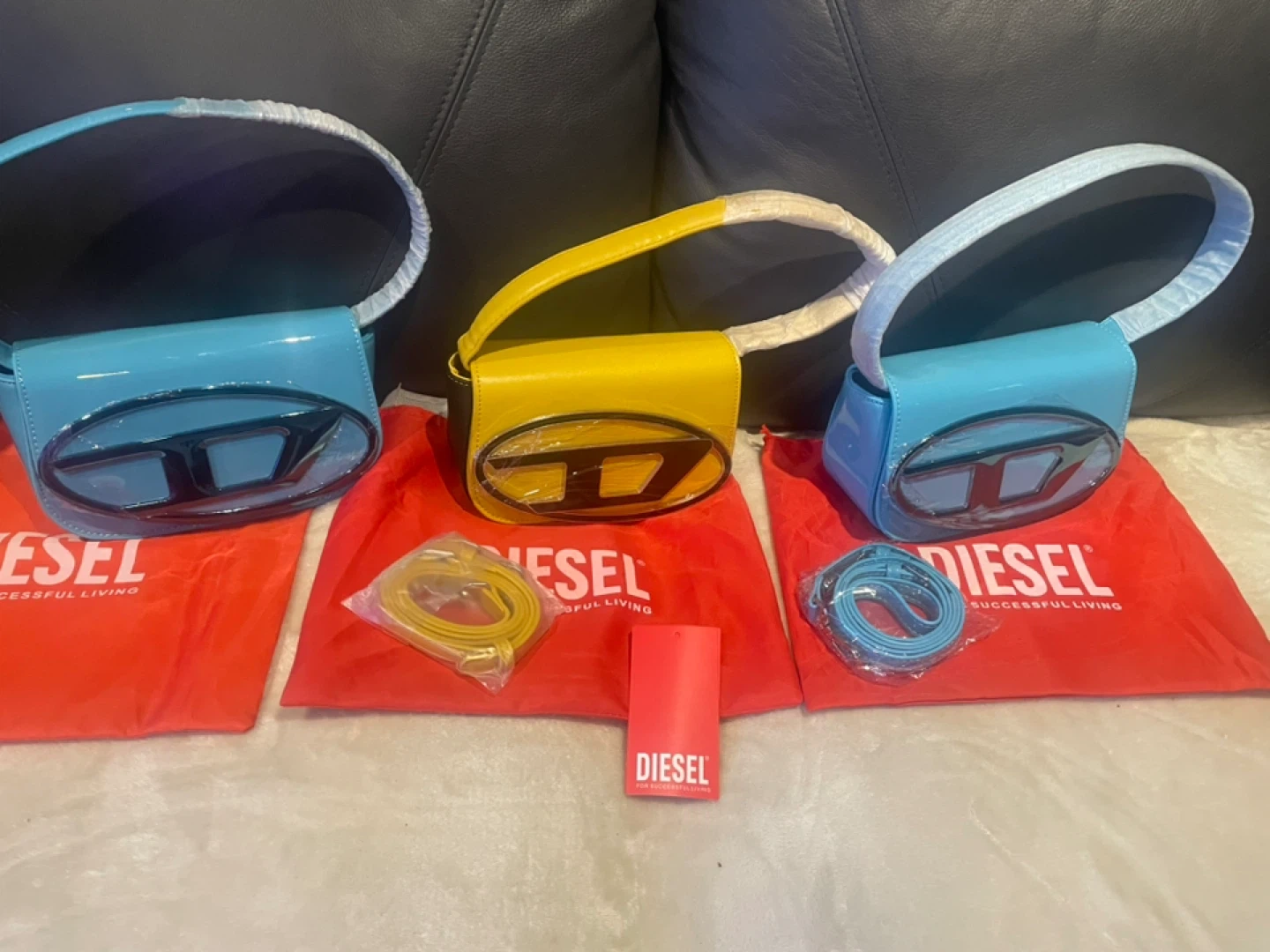 Stylish Diesel handbags crossbody available in yellow and blue. Each bag features the iconic Diesel logo. Includes adjustable straps for versatile wear.