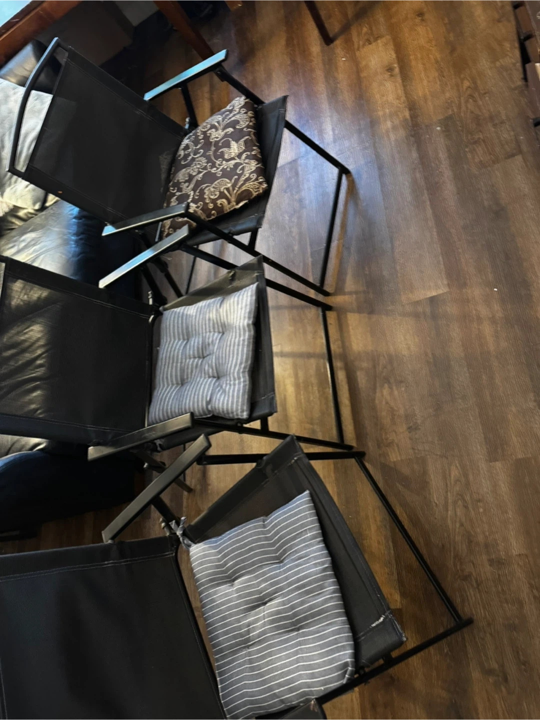Four black folding camp chairs are available. They feature comfortable padded seat cushions in a grey and white stripe pattern. A bonus decorative cushion with a brown and beige damask pattern is also included for one chair. These chairs are perfect for outdoor gatherings or extra seating.