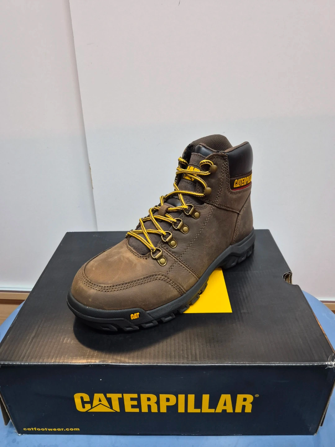 These are Caterpillar work boots. They're made of brown leather with yellow laces and black soles. Includes original box.