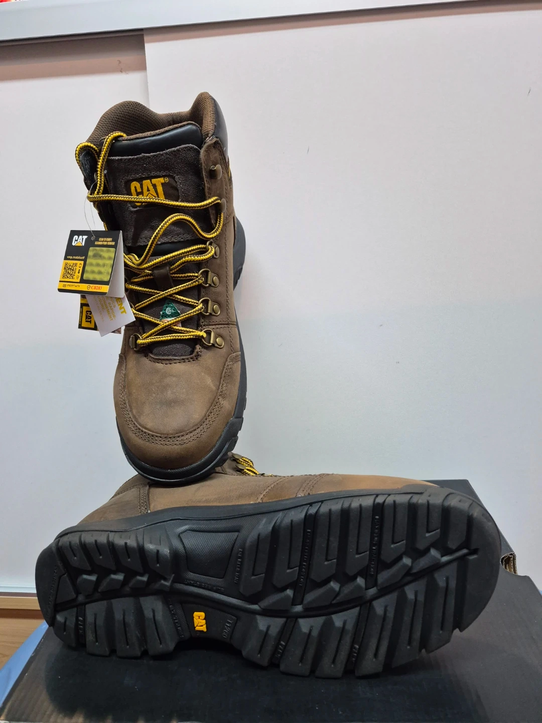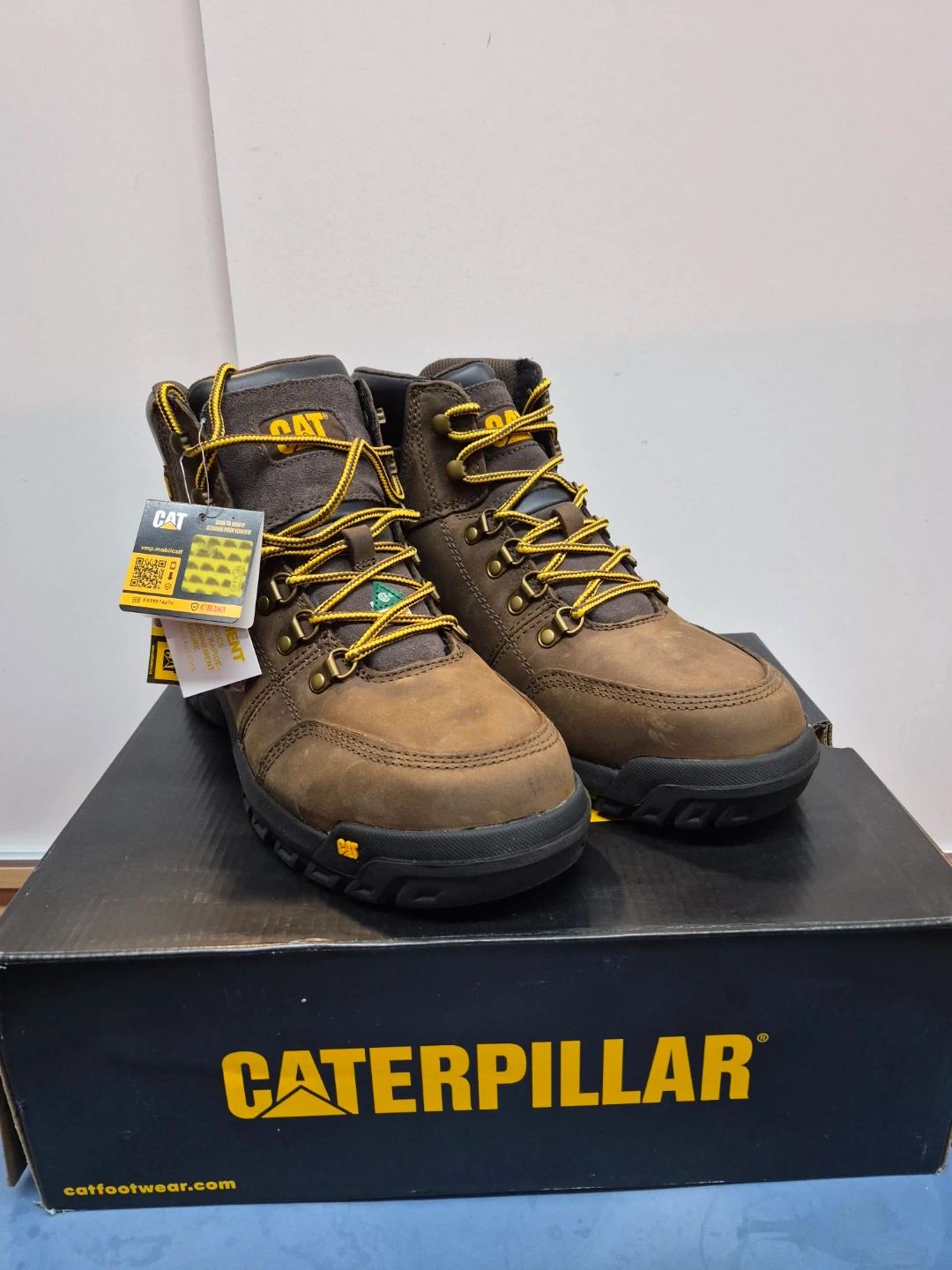 These are Caterpillar work boots. They're made of brown leather with yellow laces and black soles. Includes original box.