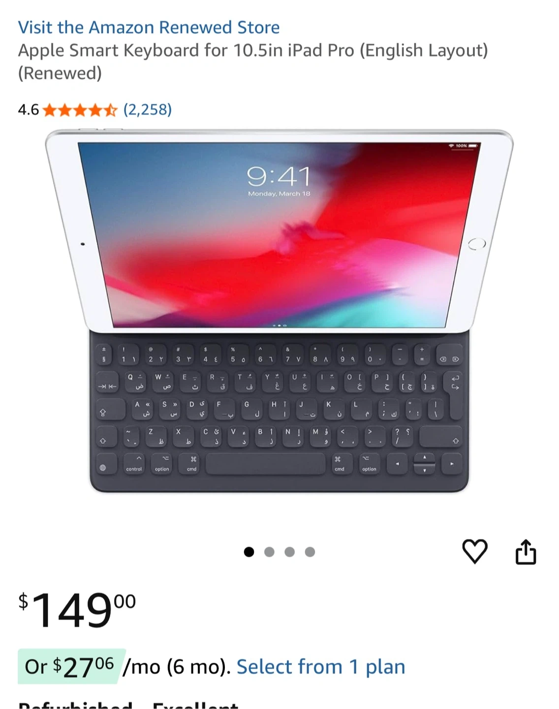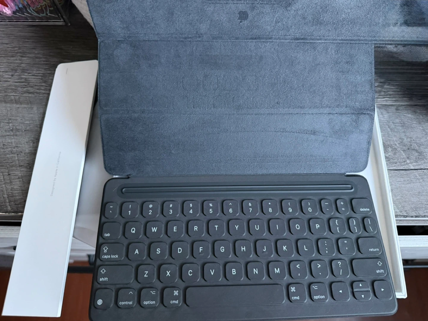 This is an Apple Smart Keyboard for the 10.5-inch iPad Pro. It's a black, English layout keyboard with a built-in cover. Designed by Apple in California and made in China.