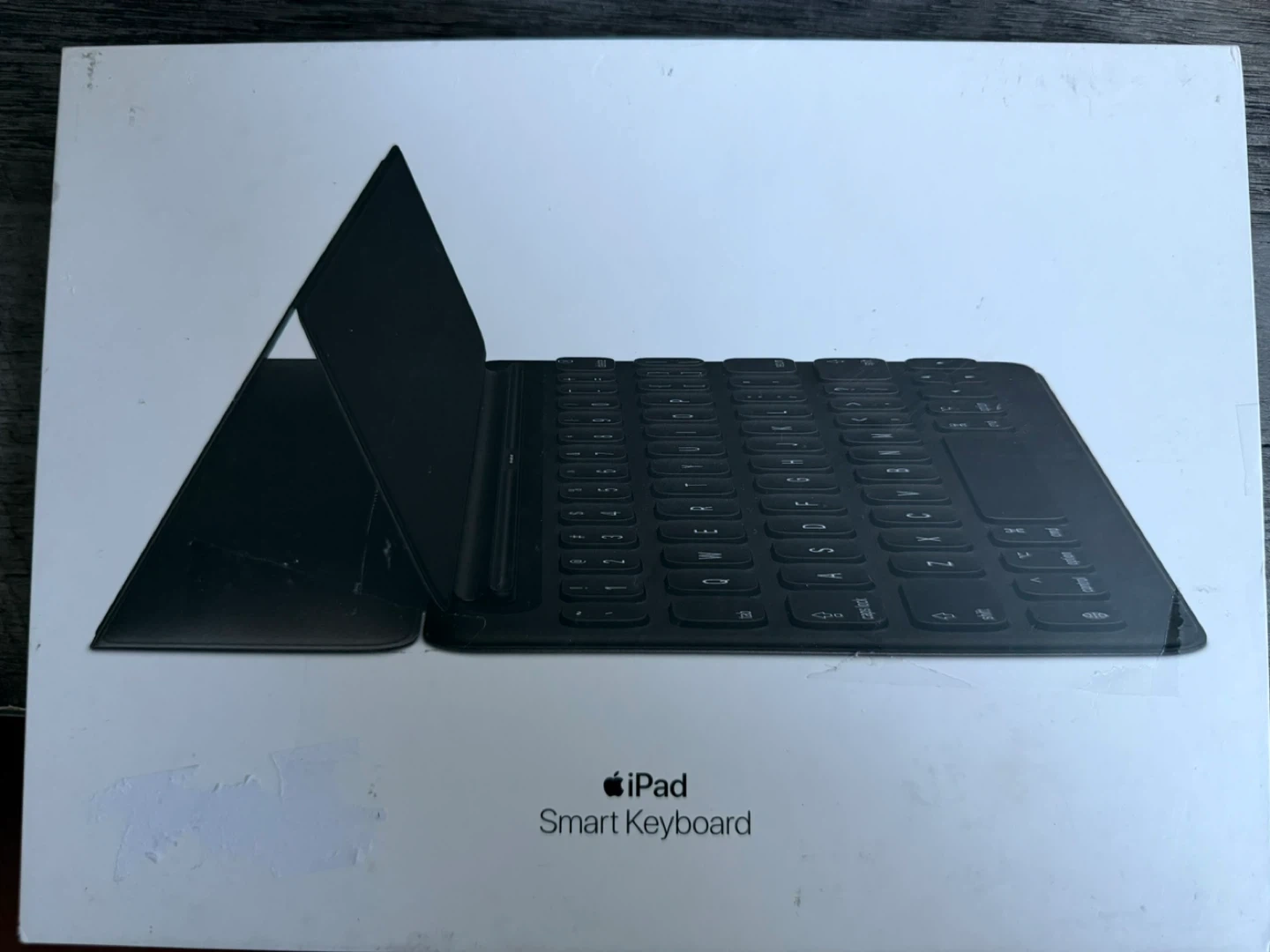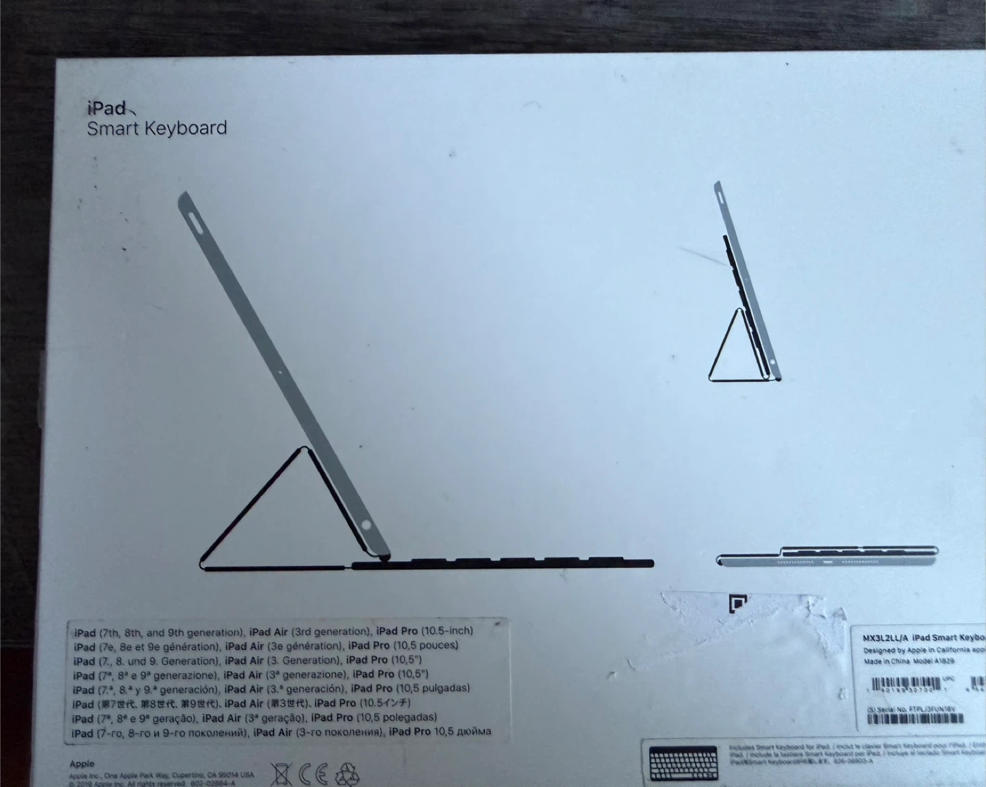 This is an Apple Smart Keyboard for the 10.5-inch iPad Pro. It's a black, English layout keyboard with a built-in cover. Designed by Apple in California and made in China.