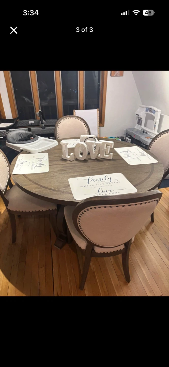 This is a round wooden dining table with four upholstered chairs. The chairs have tufted backs and wooden legs. The table has a distressed wood finish. Includes two extra chairs and leaf extension.