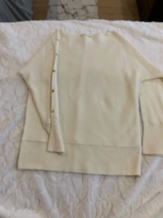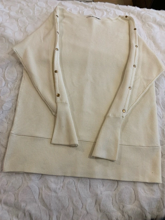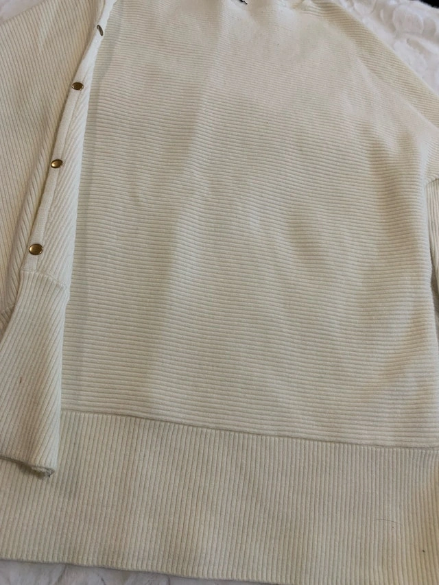 Elevate your wardrobe with this stylish Zara sweater, featuring a unique side-button detail and a comfortable, ribbed knit. This sweater is in used-good condition, offering both fashion and comfort for any occasion. Specifications: - Brand: Zara - Style: Sweater - Colour: Cream - Material: Ribbed knit - Condition: Used-Good - Details: Side-button accent. Size: Medium (8-10). Cash accepted.