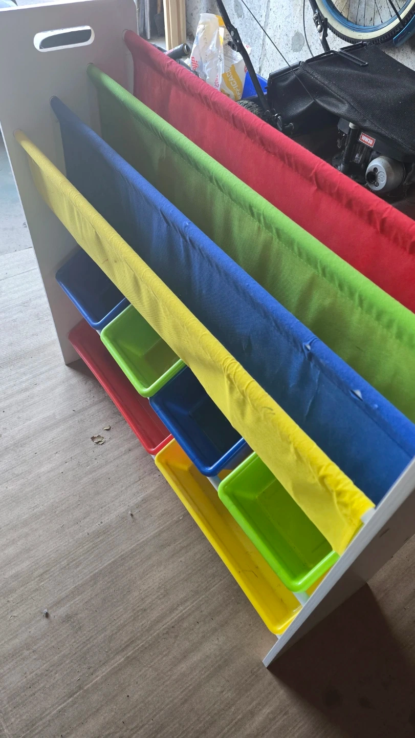 This is a kids' toy organizer shelf with multiple colourful compartments. It's made of white wood and fabric shelves with plastic bins. Great for storing books and toys!