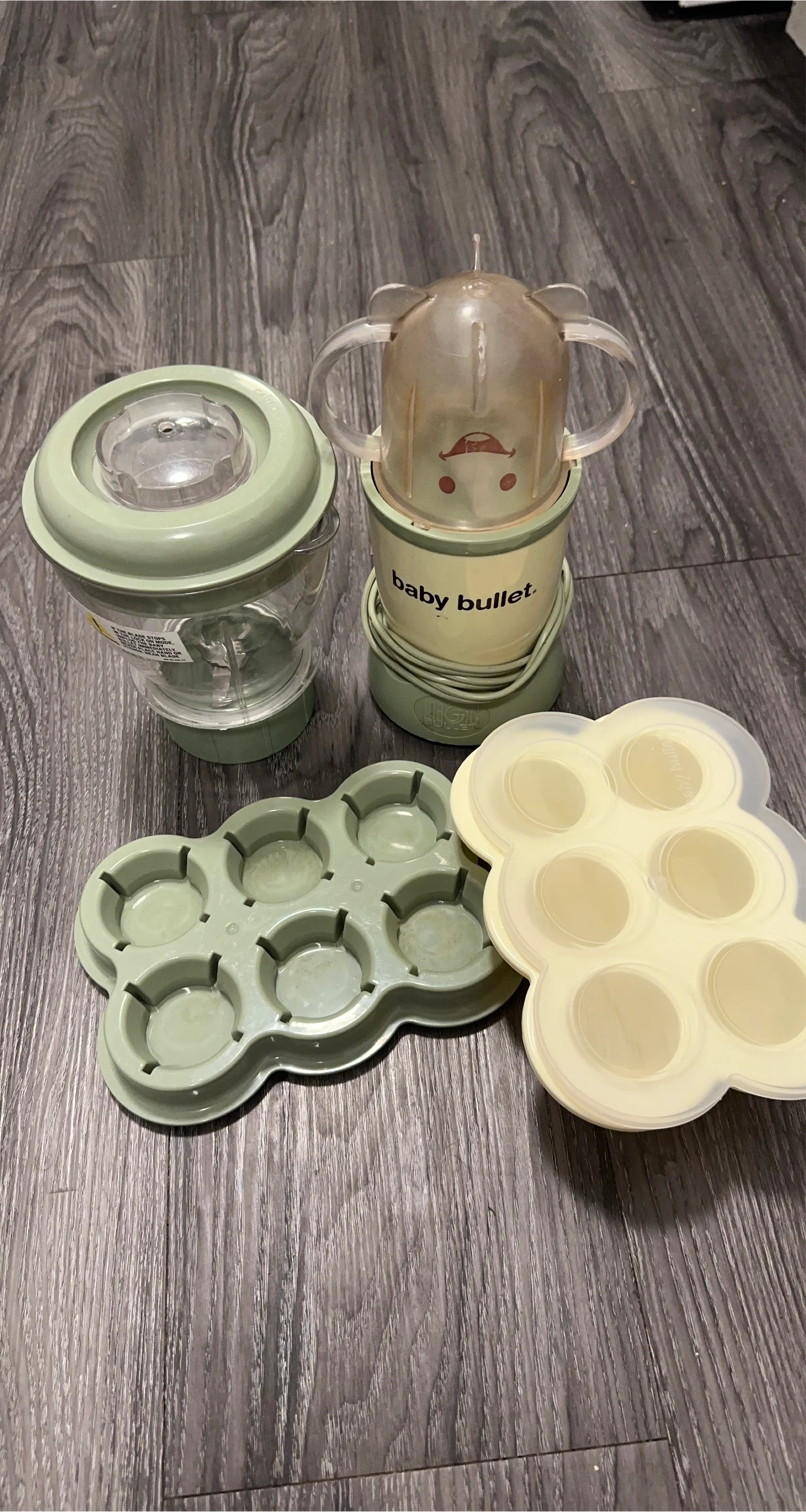 This is a Baby Bullet food maker system with two storage trays. It includes the blender base, cup, and two silicone trays for freezing portions. It's great for making purees and baby food!