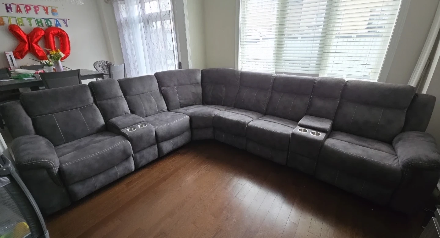 *MOVING SALE* This is a dark grey reclining sectional sofa. It features multiple reclining seats and convenient built-in cup holders. The stitching is a contrasting white detail. Storage included with charging stations built in. Very very easy material to clean. Had for 6 months in great condition , smoke free ,pet free home.