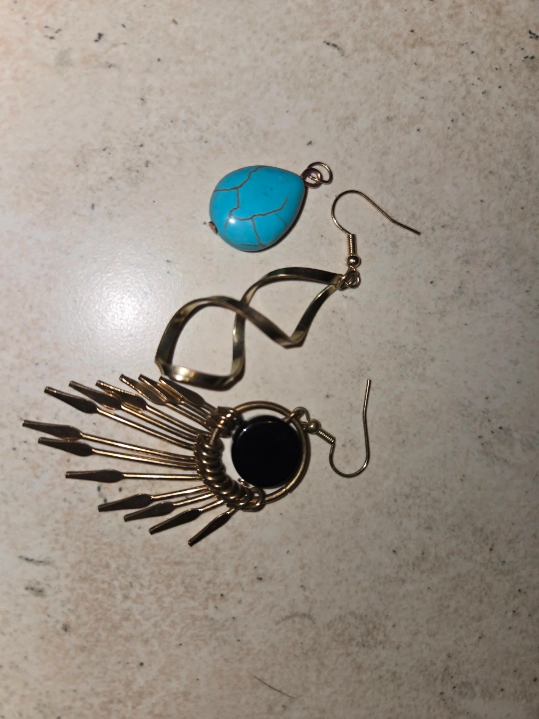 A collection of various pieces, including gold-tone earrings, leaf designs, a turquoise stone dangle pendant, a twisted rope style, circular abstract shapes, and a fan-shaped design with a black centre. These are great for adding a stylish touch to any outfit! Available for trade or purchase, separately or together. Make an offer on the one(s) you want!