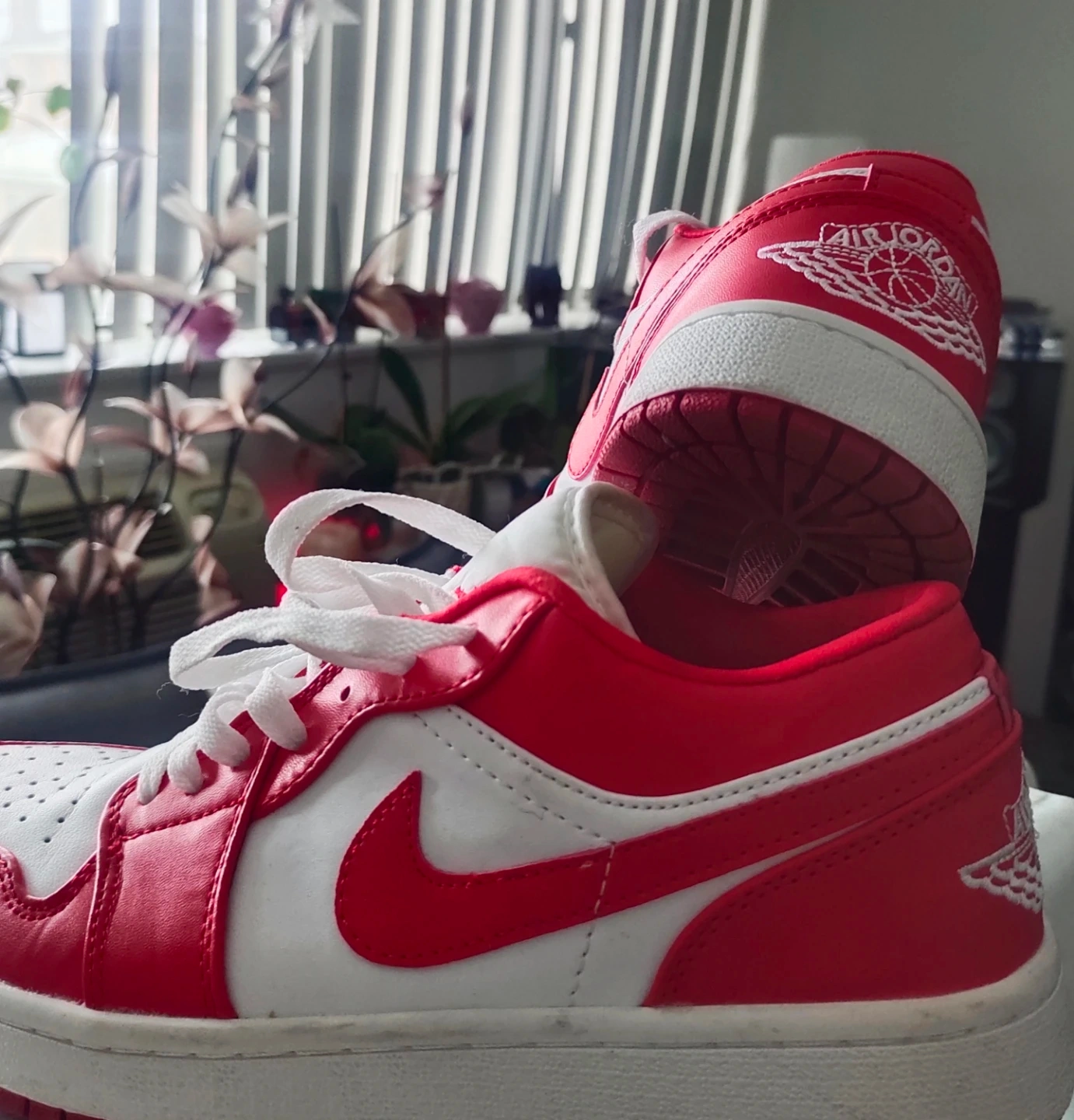 These are Air Jordan 1 Low sneakers in a classic red and white colourway. They're made with a leather upper and rubber sole. These kicks are perfect for everyday wear or hitting the court!