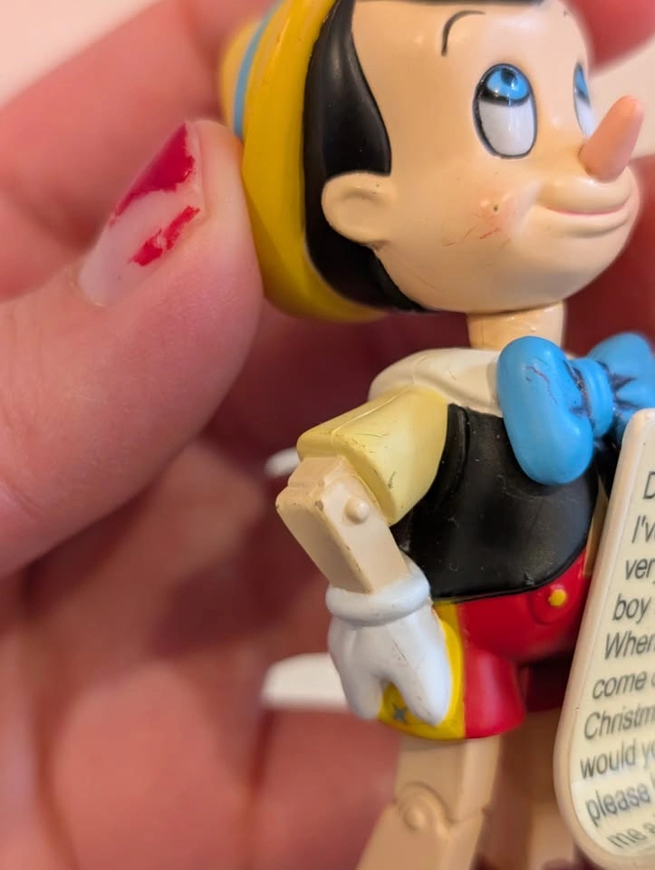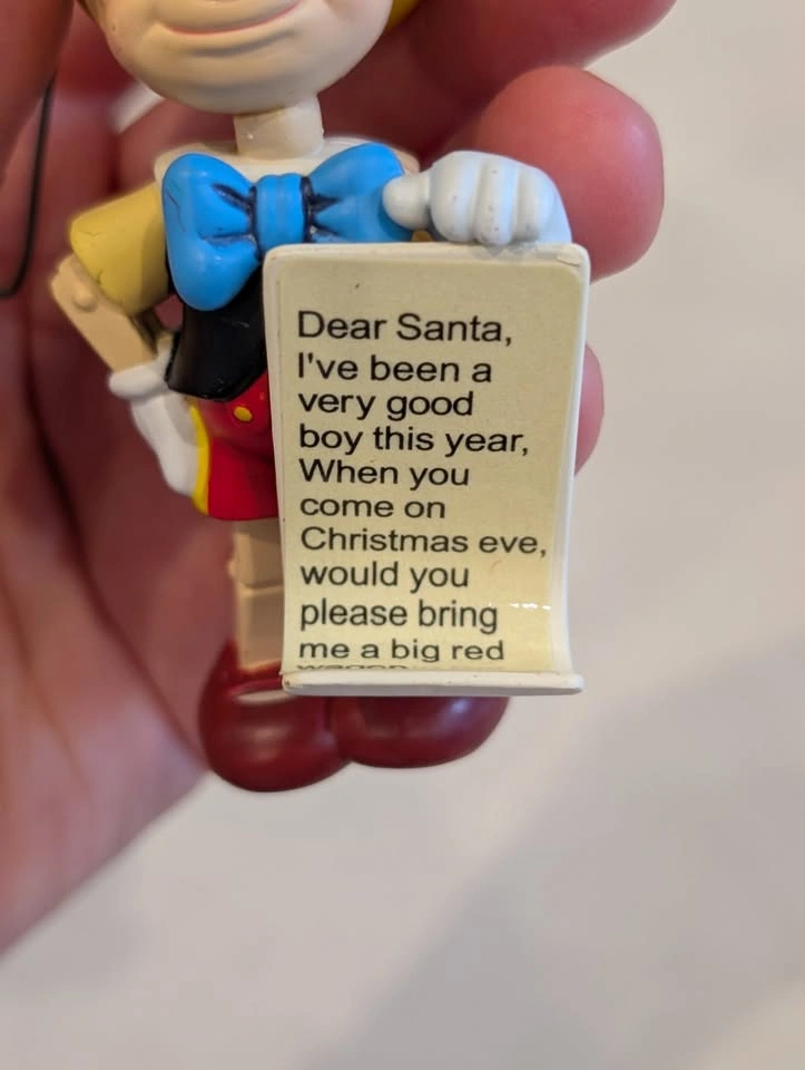 This piece is part of the "Disney Christmas Magic" collection and features Pinocchio holding an adorable letter to Santa that reads, "Dear Santa, I've been a very good boy this year. When you come on Christmas eve, would you please bring me a big red..."