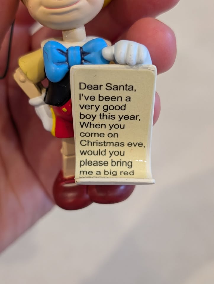 This piece is part of the "Disney Christmas Magic" collection and features Pinocchio holding an adorable letter to Santa that reads, "Dear Santa, I've been a very good boy this year. When you come on Christmas eve, would you please bring me a big red..."