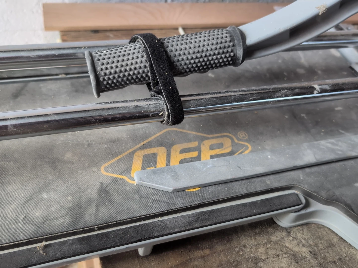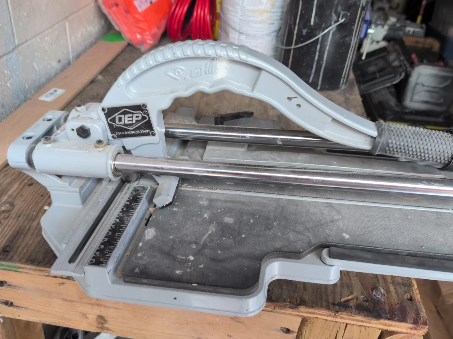 This is a DEP tile cutter. It's grey and has a comfortable grip handle. The cutting surface is black and shows some dust. It's a sturdy tool for cutting tiles.