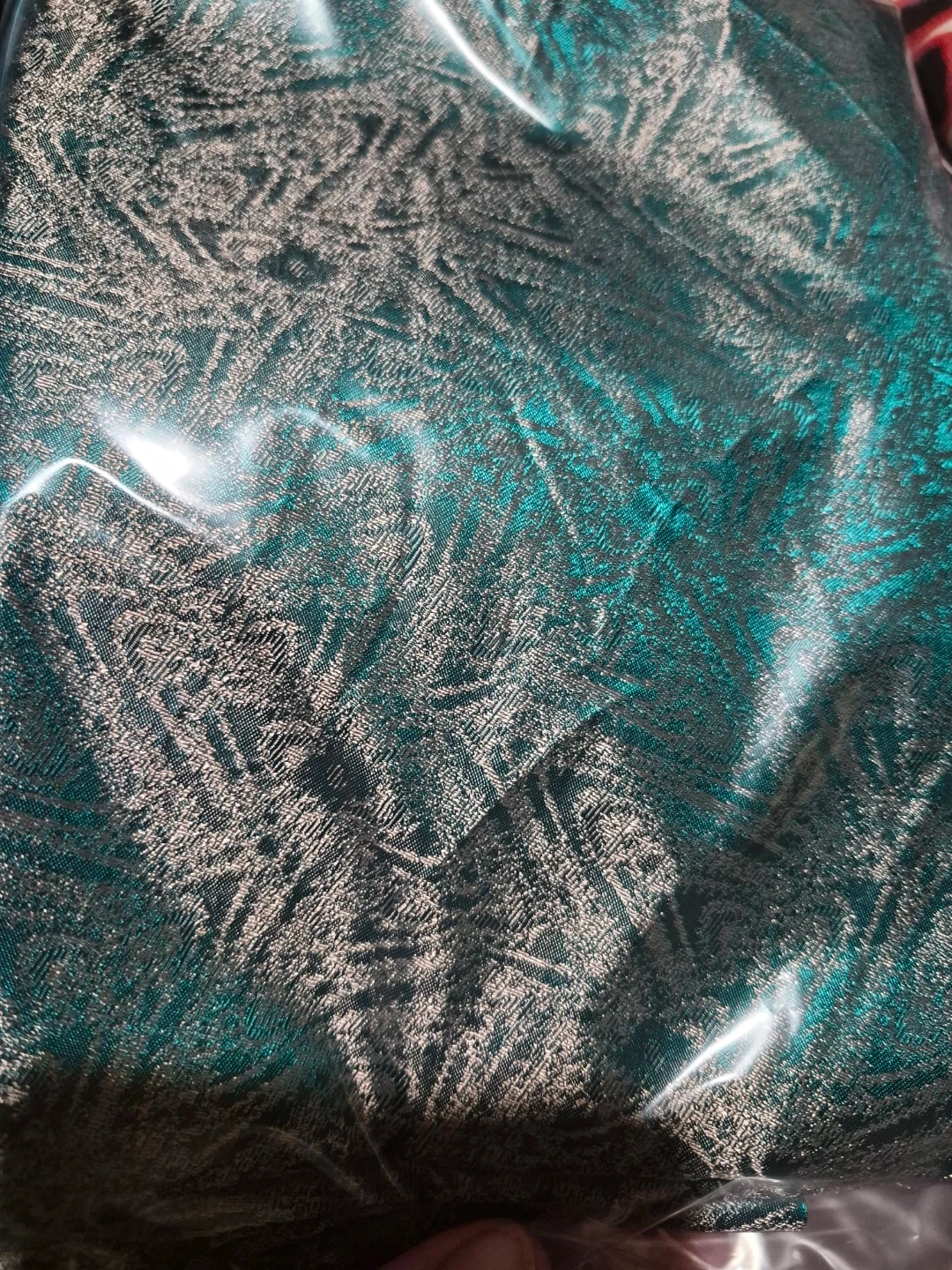 Teal coloured brocade fabric with a metallic sheen. Features a textured woven pattern. It's suitable for crafting or sewing projects. This fabric adds a luxurious feel to any creation! 120 x 45 inches roughly
