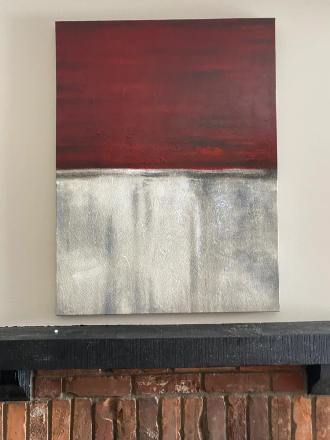 This square canvas art features a textured abstract design with a deep red band across the top and a textured grey band below. It's a striking piece for any room. Canvas material.