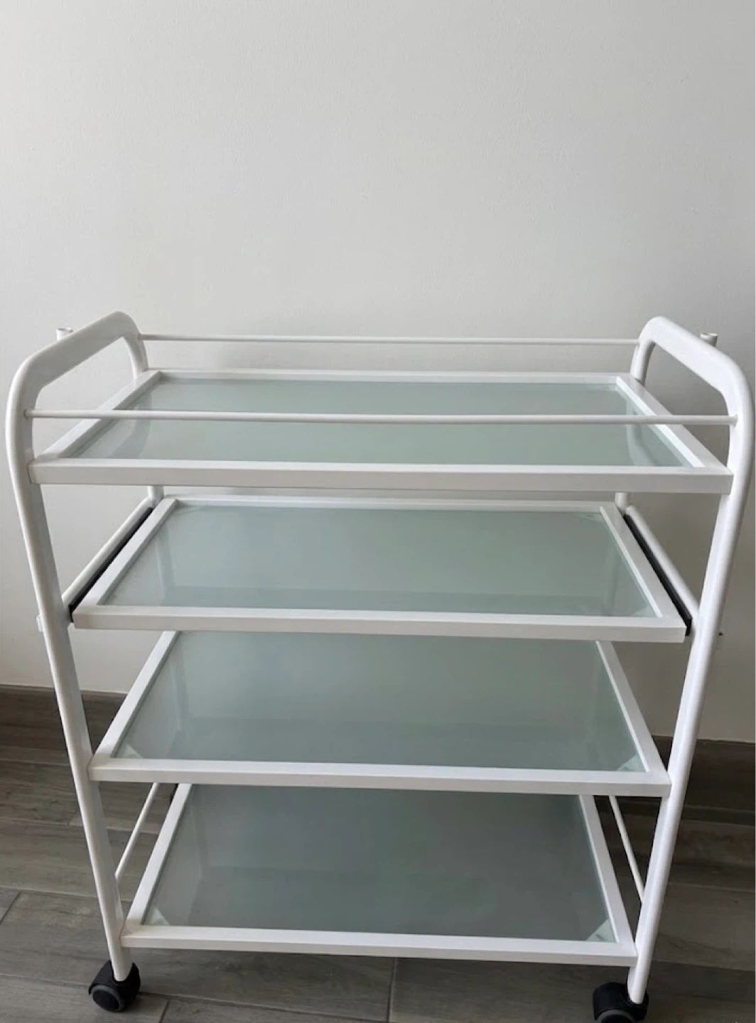 Professional rolling beauty cart with 4 tiers, perfect for estheticians, lash artists, tattoo studios, or hair salons. The sleek white metal frame and frosted glass shelves give it a very clean and modern look.
