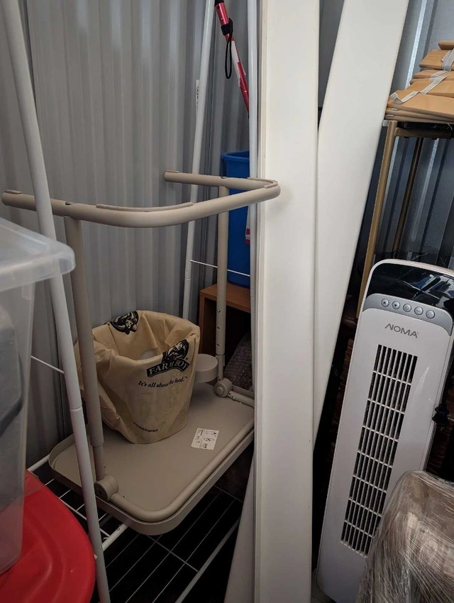 White metal clothing rack with hanging bar and bottom shelf for shoes or storage. Great for apartments, small closets, or extra clothing. In storage currently (see second pic). Lightweight but sturdy and easy to move. Moving sale.