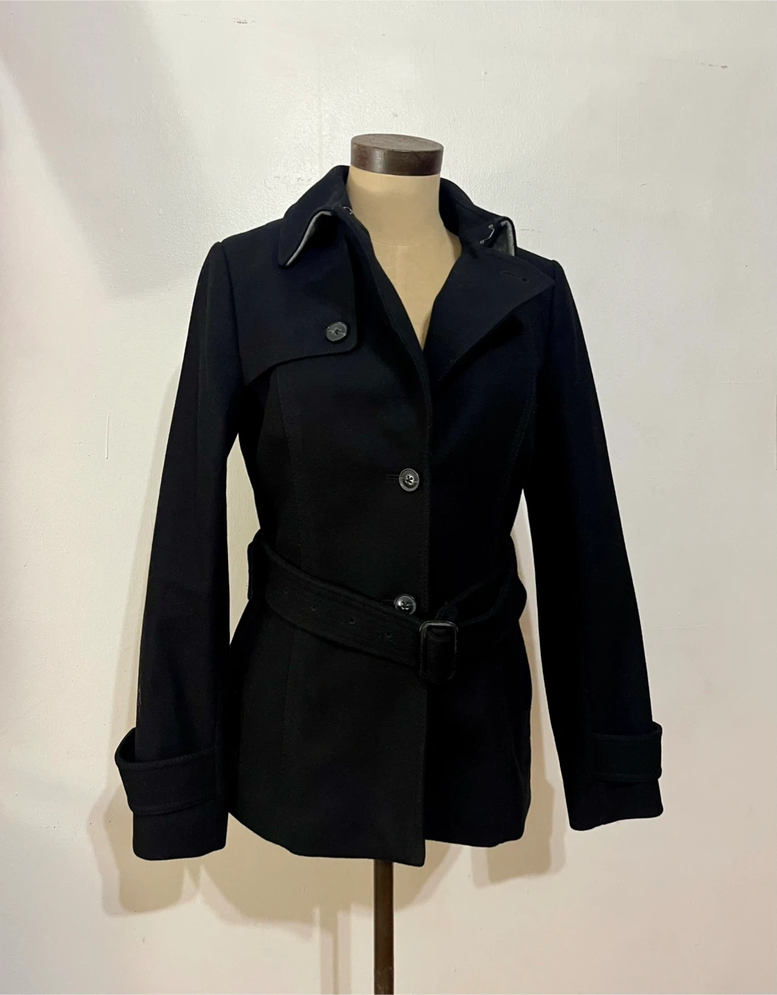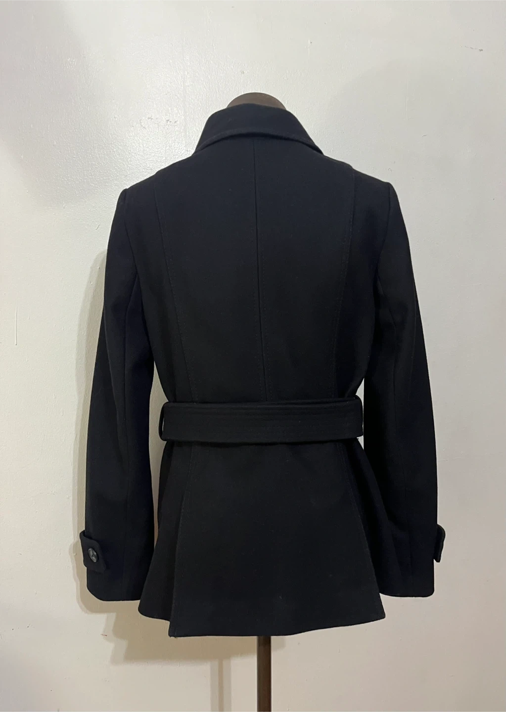 This Banana Republic short coat is made from a wool blend. It features a belted waist and button closure. Size is 2. Very fitted.