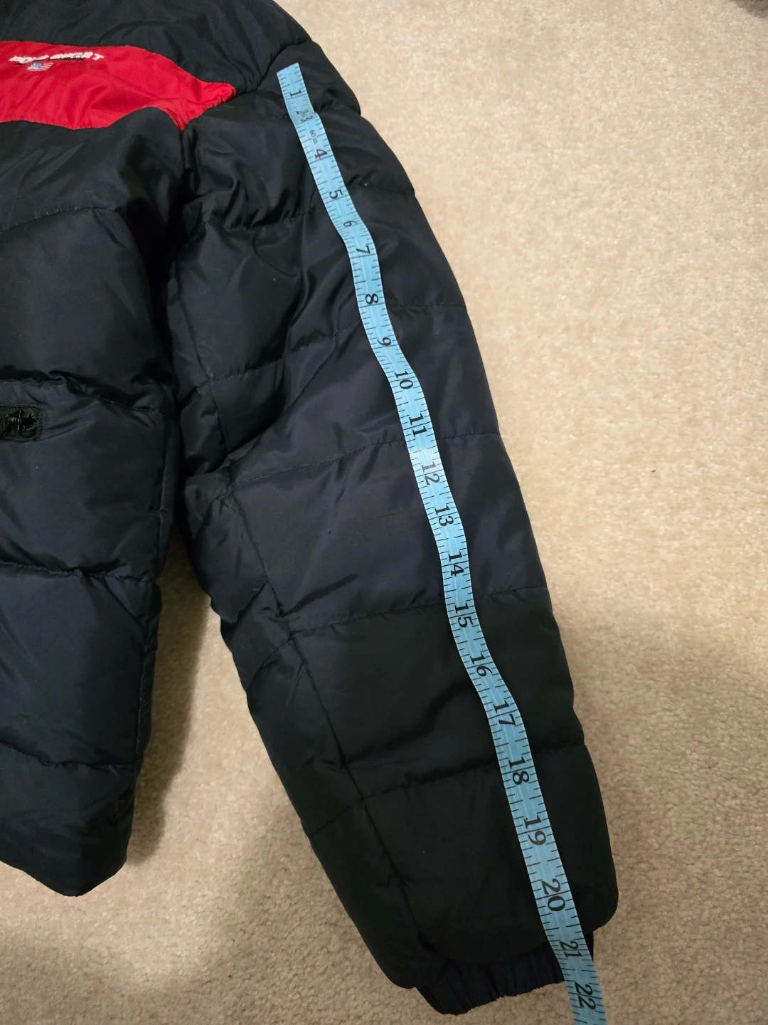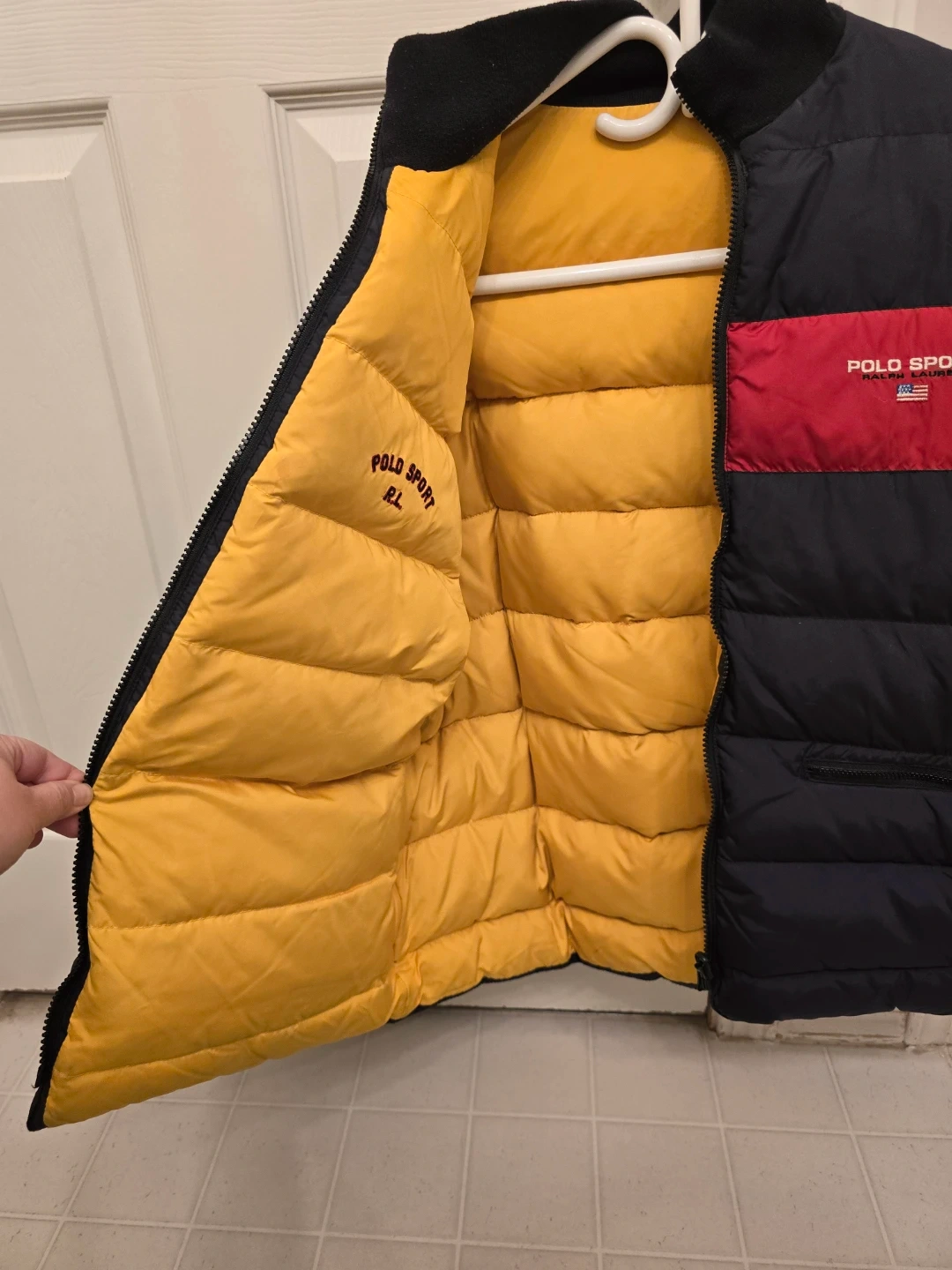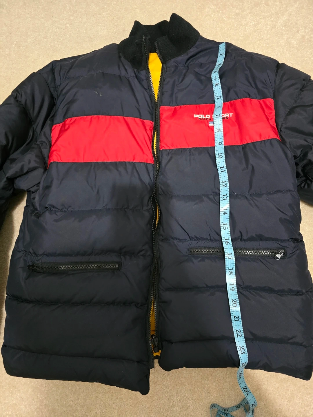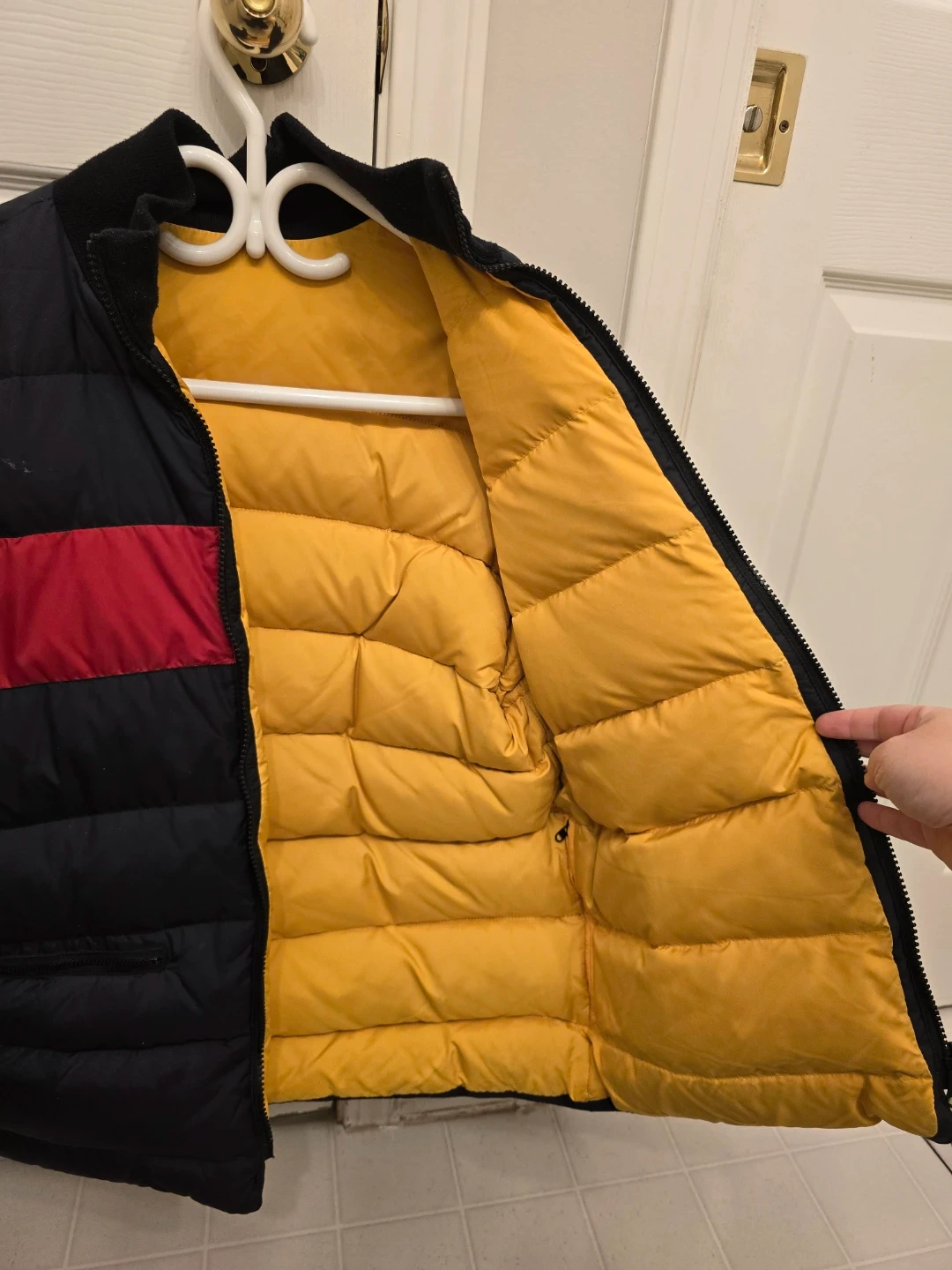 Puffer jacket in classic navy blue with a bold red stripe. Reversible design with a bright yellow interior. Very warm and stylish for winter.