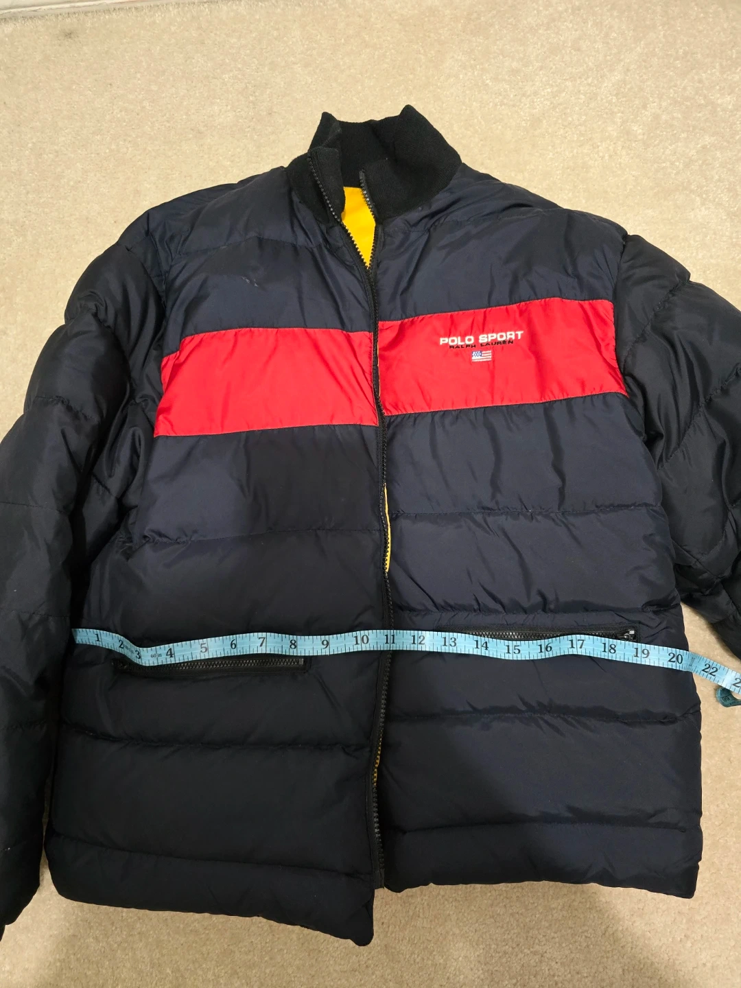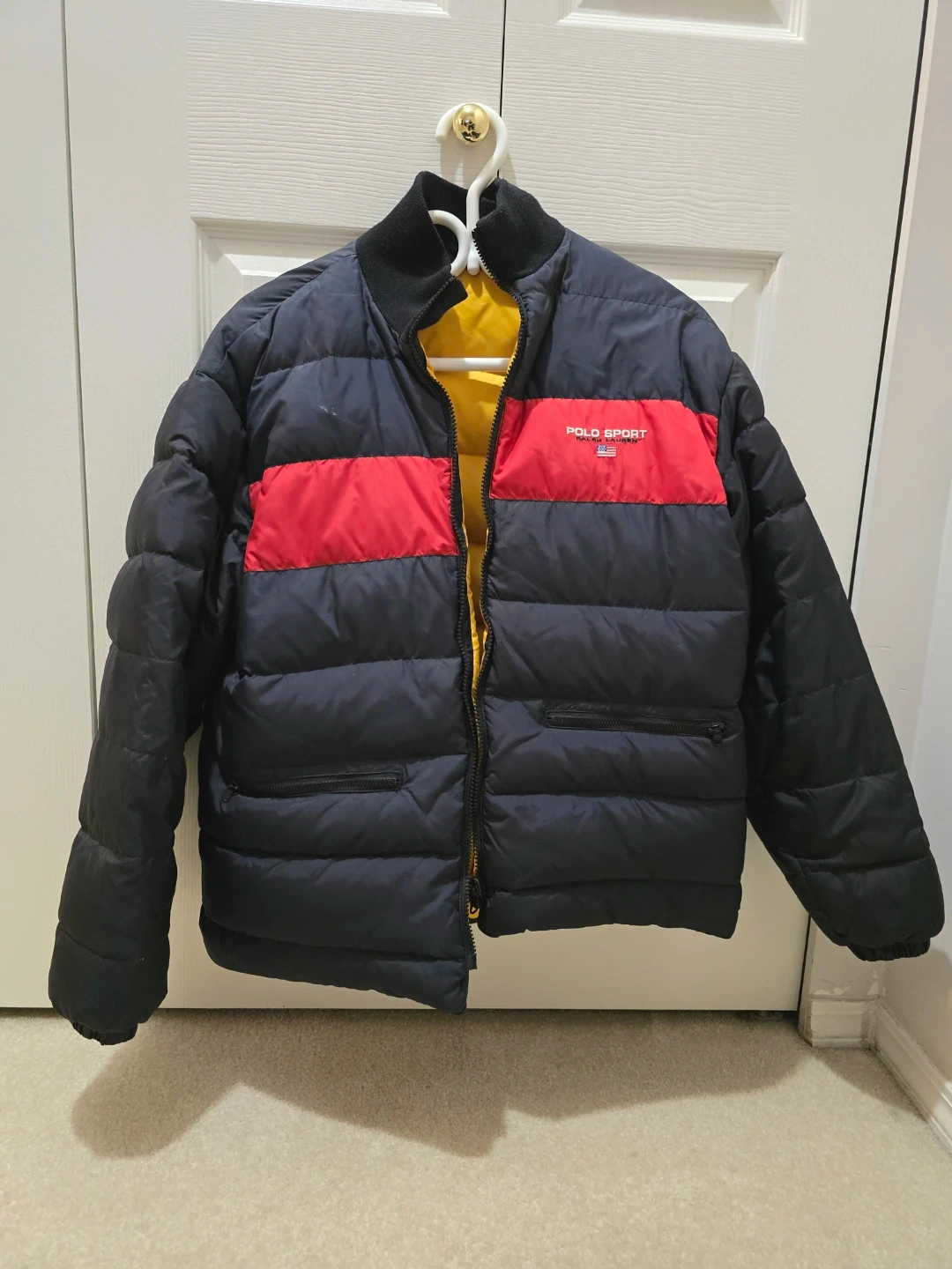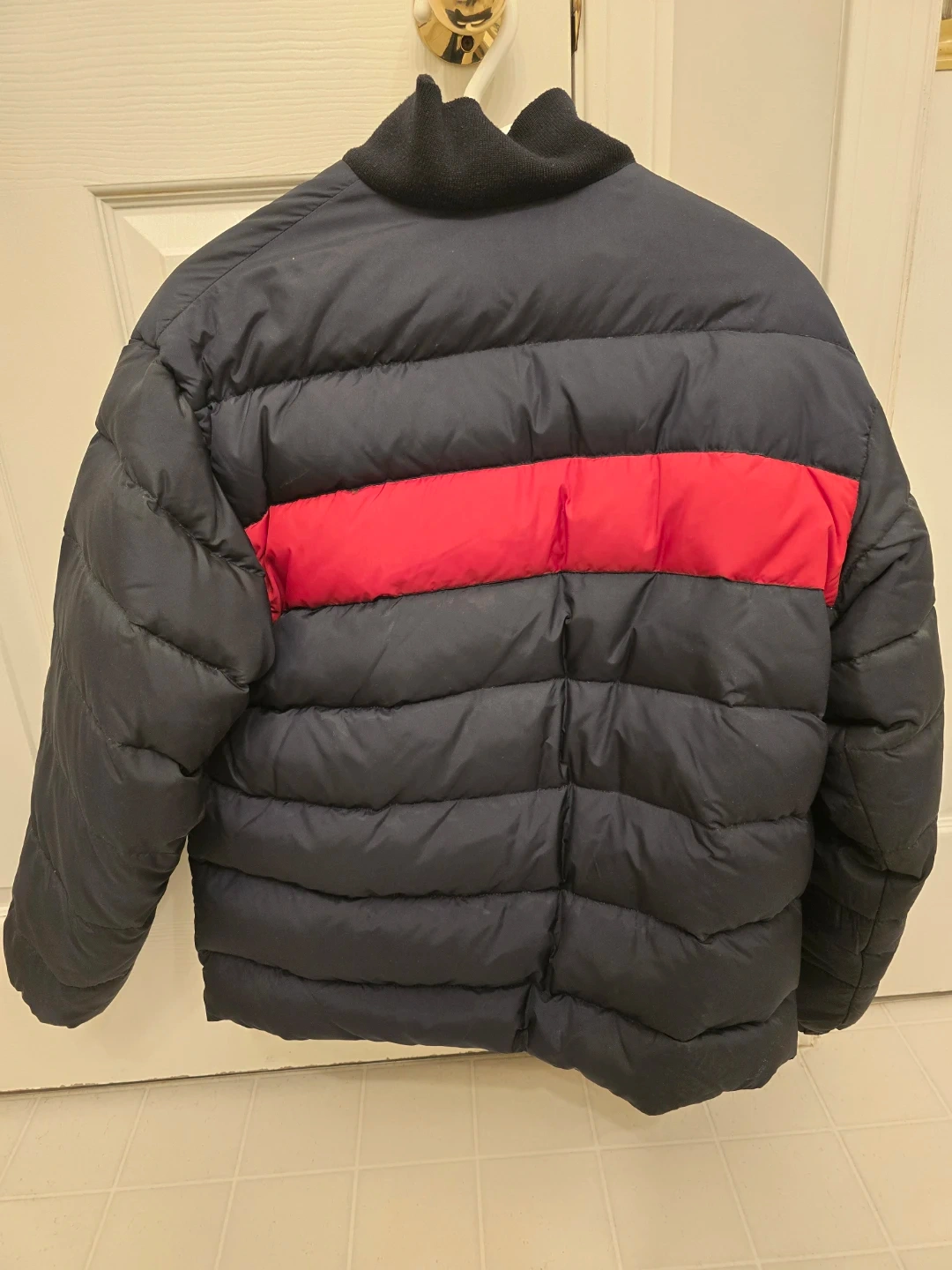 Puffer jacket in classic navy blue with a bold red stripe. Reversible design with a bright yellow interior. Very warm and stylish for winter.