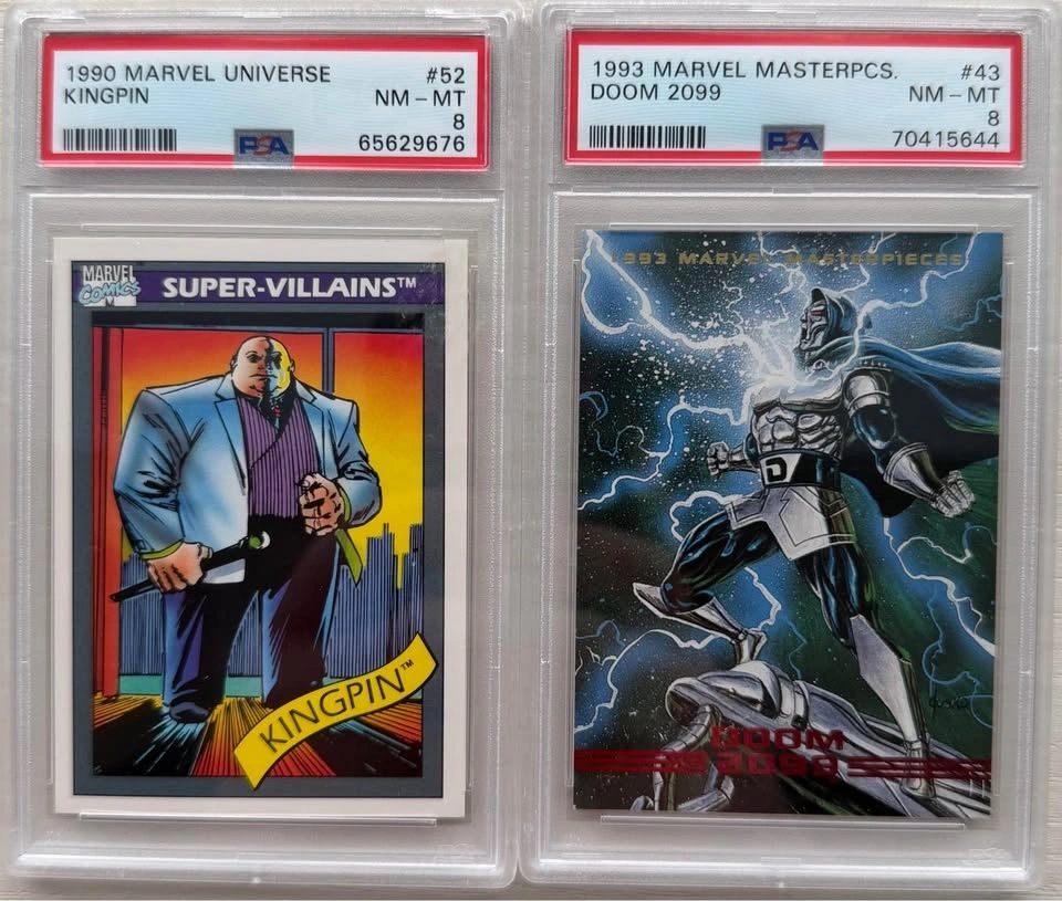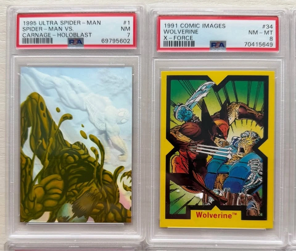 Collection of 10 PSA graded Marvel trading cards from classic early-90s Marvel sets including Marvel Universe, Marvel Masterpieces, and Ultra Spider-Man. Great lot for collectors, Marvel fans, or resellers. Characters include: Wolverine (multiple cards), Venom, Carnage, Ghost Rider, Kingpin, Namor, Doom 2099. Graded by PSA (Professional Sports Authenticator) with grades ranging NM 7 to NM-MT 8. Highlighted cards: 1995 Ultra Spider-Man – Spider-Man vs Carnage Holoblast – PSA 7, 1992 Marvel Universe Venom – PSA 8, 1990 Marvel Universe Wolverine – PSA 8, 1993 Marvel Masterpieces Doom 2099 – PSA 8, 1990 Marvel Universe Ghost Rider Rookie – PSA 7. All slabs are authentic PSA graded cards and in excellent condition. Selling as a complete lot only. Perfect display pieces for Marvel collectors or a great starter graded collection. Pickup near Tottenham (Queen St N area).