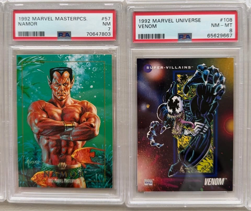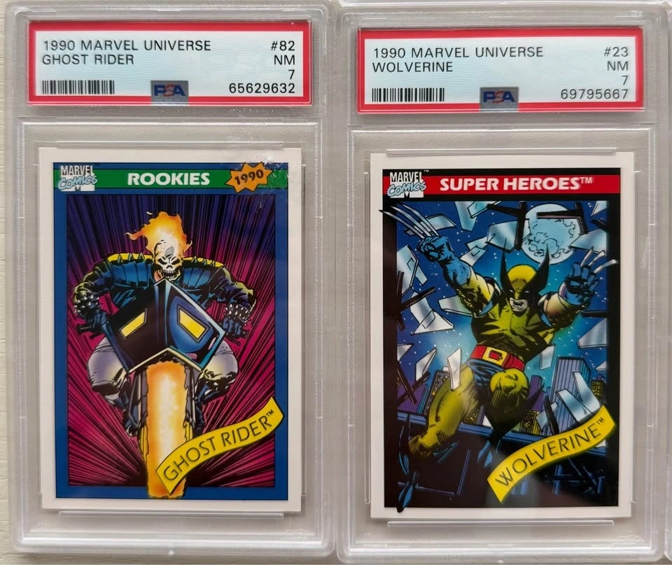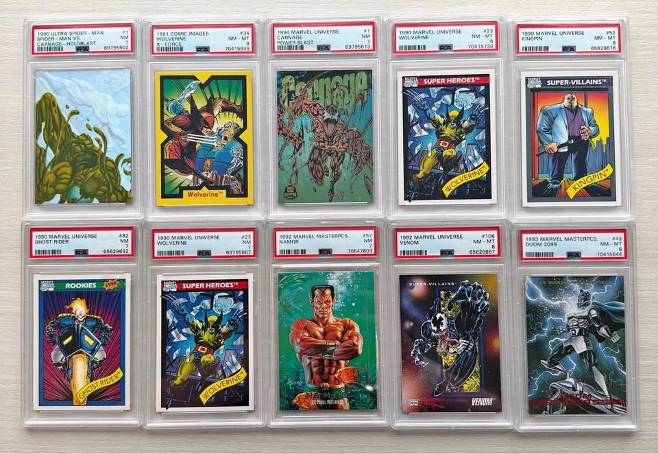 Collection of 10 PSA graded Marvel trading cards from classic early-90s Marvel sets including Marvel Universe, Marvel Masterpieces, and Ultra Spider-Man. Great lot for collectors, Marvel fans, or resellers. Characters include: Wolverine (multiple cards), Venom, Carnage, Ghost Rider, Kingpin, Namor, Doom 2099. Graded by PSA (Professional Sports Authenticator) with grades ranging NM 7 to NM-MT 8. Highlighted cards: 1995 Ultra Spider-Man – Spider-Man vs Carnage Holoblast – PSA 7, 1992 Marvel Universe Venom – PSA 8, 1990 Marvel Universe Wolverine – PSA 8, 1993 Marvel Masterpieces Doom 2099 – PSA 8, 1990 Marvel Universe Ghost Rider Rookie – PSA 7. All slabs are authentic PSA graded cards and in excellent condition. Selling as a complete lot only. Perfect display pieces for Marvel collectors or a great starter graded collection. Pickup near Tottenham (Queen St N area).