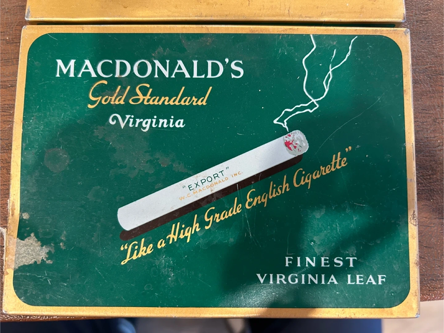 This is a vintage MacDonald's Gold Standard Virginia cigarette tin. It features "Like a High Grade English Cigarette" text and imagery of a cigarette. The tin also has a decorative graphic of a Scottish Highlander inside the lid. Made by W.C. MacDonald Inc. in Montreal, Canada, it's a piece of Canadian tobacco history.