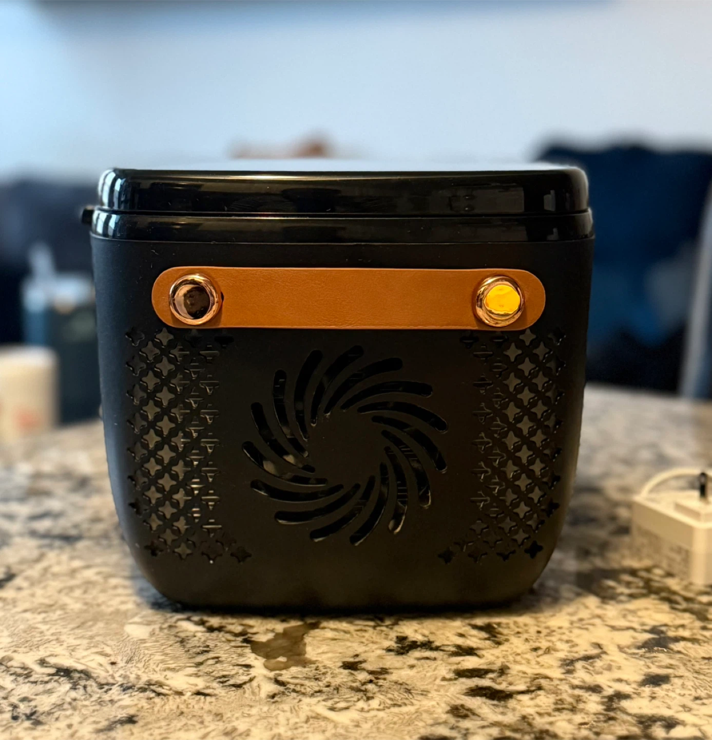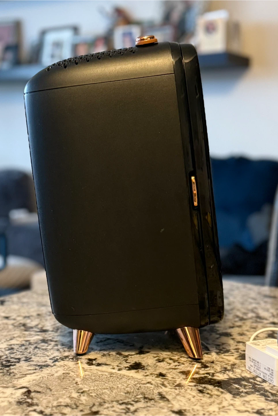 Stylish mini beauty fridge with mirrored LED front and rose gold details. Ideal for storing skincare, serums, masks, or cosmetics. Includes a removable shelf and power adapter.