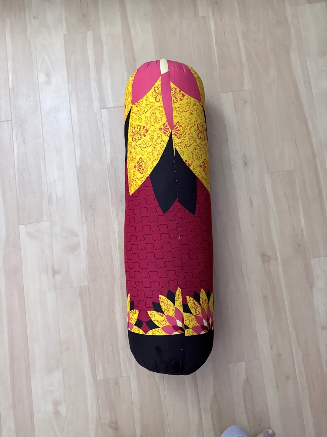 Cylindrical bolster pillow with a vibrant, ornate pattern. It's perfect for adding a decorative touch to your couch or bed. Pillow cover is made of a soft fabric.