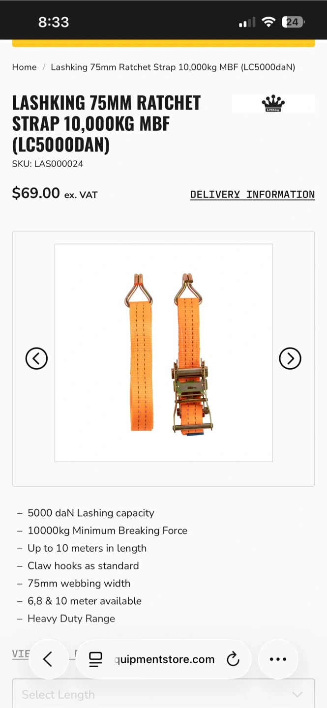 These Lashking 75mm ratchet straps have a 10,000kg Minimum Breaking Force. They feature claw hooks as standard and have a webbing width of 75mm. Available in 10 meter lengths.