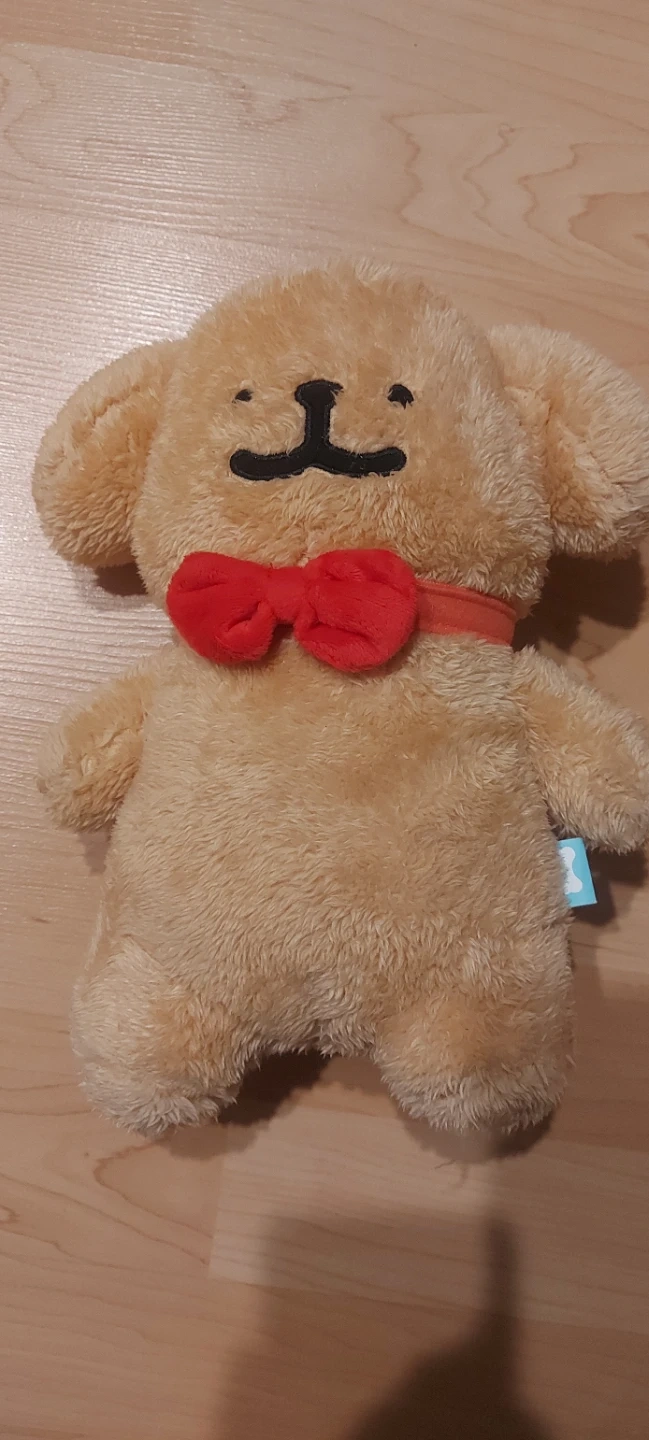 A cute, fluffy tan plush dog toy wearing a red bow tie and orange collar. It's soft to the touch and made for cuddles. This toy would be a great companion for children!