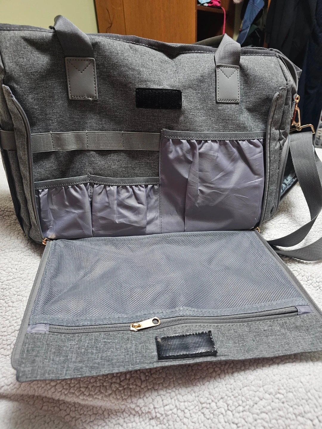 Grey diaper bag with quilted front pockets and gold zipper accents. It's made of durable fabric and includes a shoulder strap. This bag has multiple compartments for organizing baby essentials, or just taking your lunch with you to work.