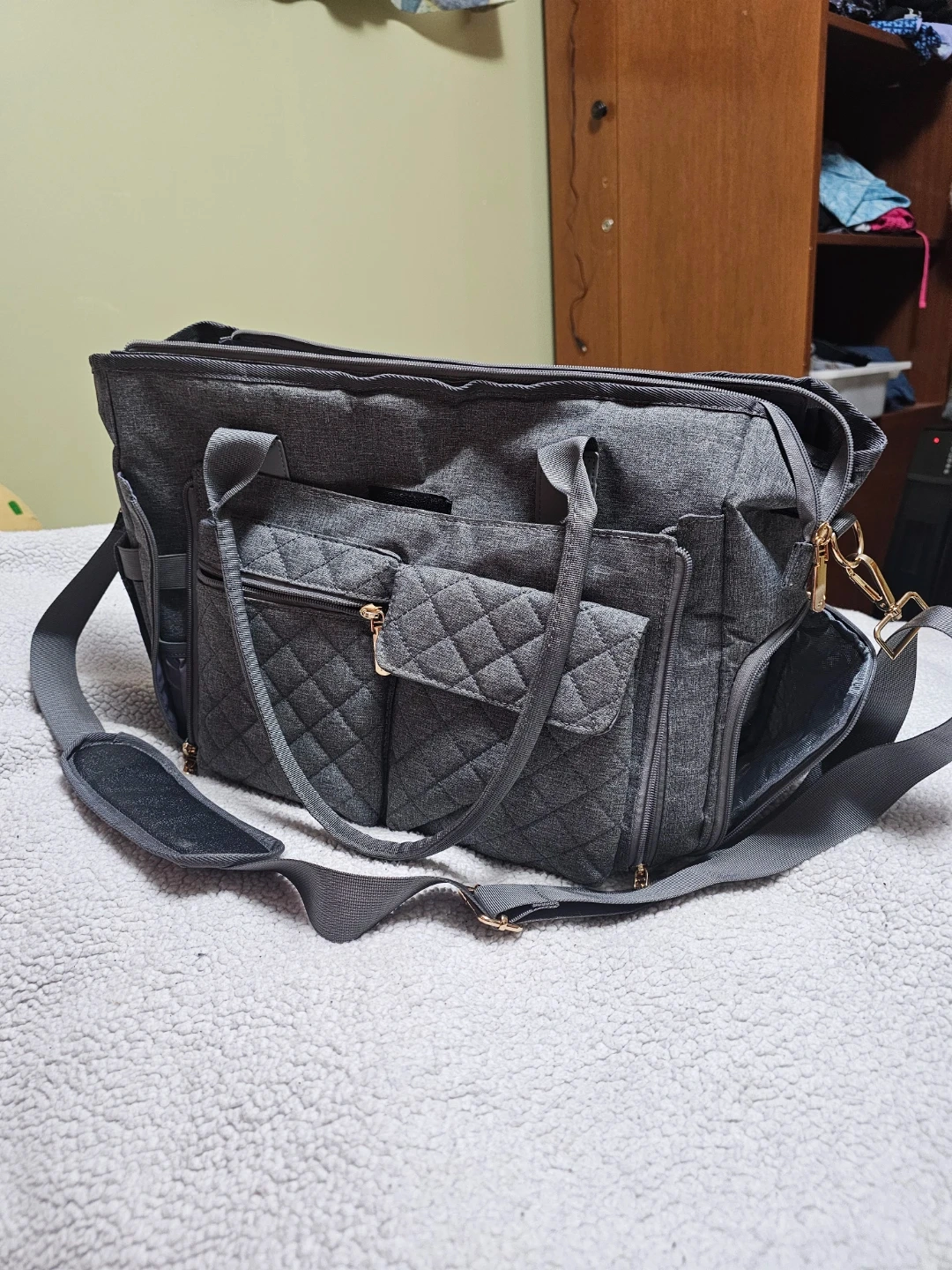 Grey diaper bag with quilted front pockets and gold zipper accents. It's made of durable fabric and includes a shoulder strap. This bag has multiple compartments for organizing baby essentials, or just taking your lunch with you to work.