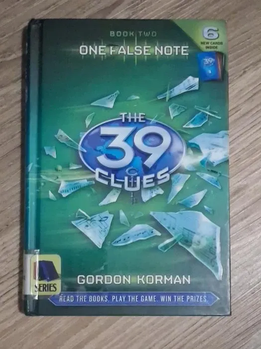 This is Book Two of The 39 Clues series, titled "One False Note" by Gordon Korman. It's part of a series where you read books, play the game, and win prizes. The book includes 6 new cards inside.