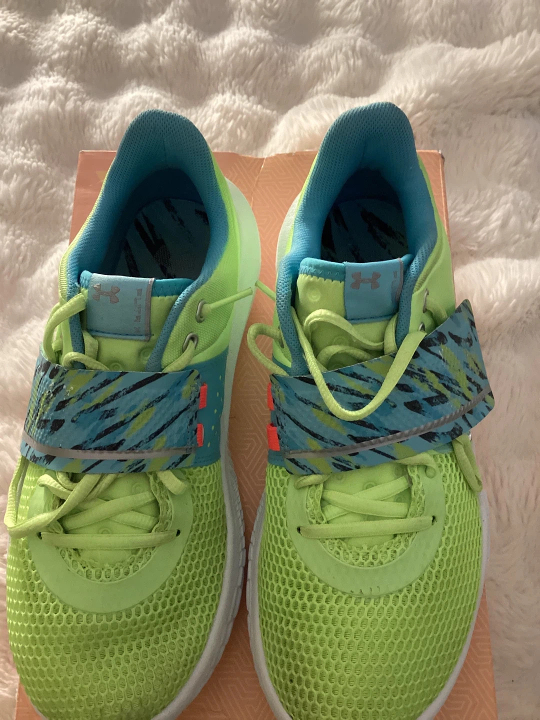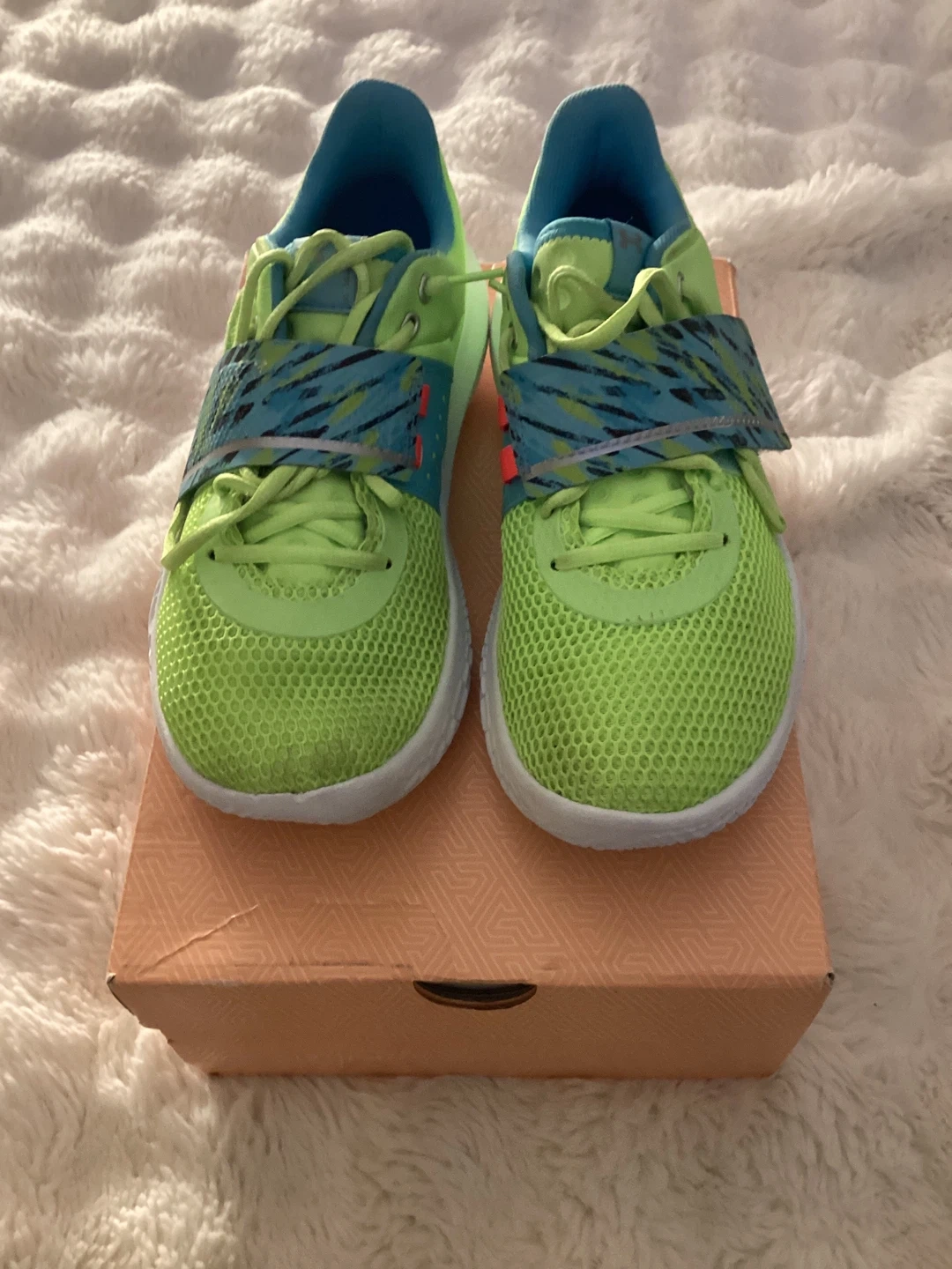 These vibrant neon green and blue Under Armour youth shoes are built for performance. They feature a secure strap closure and durable sole. Perfect for active kids who need reliable footwear.