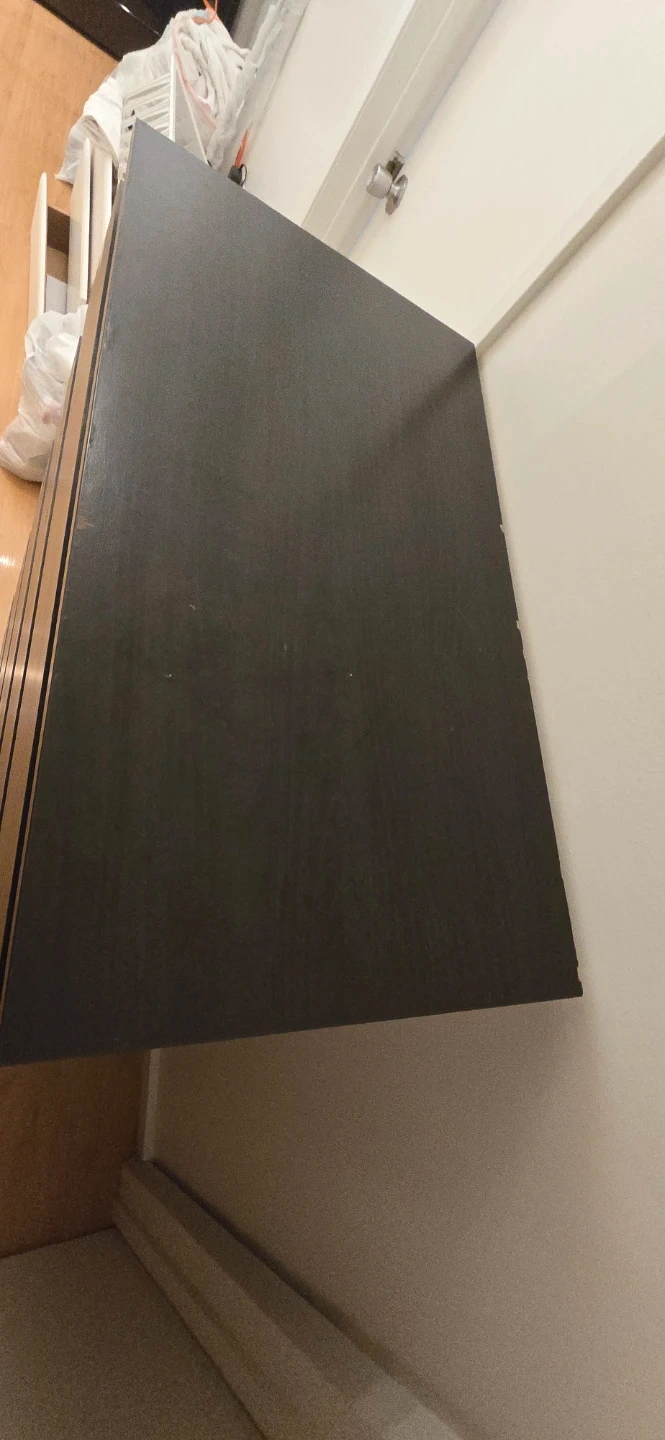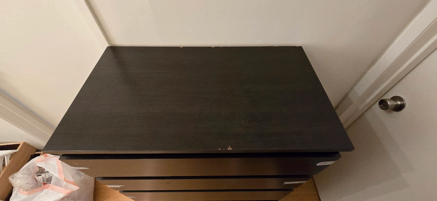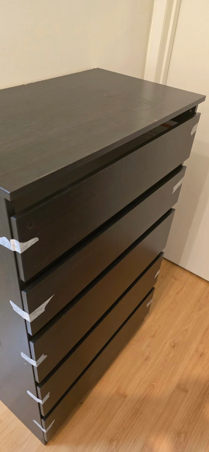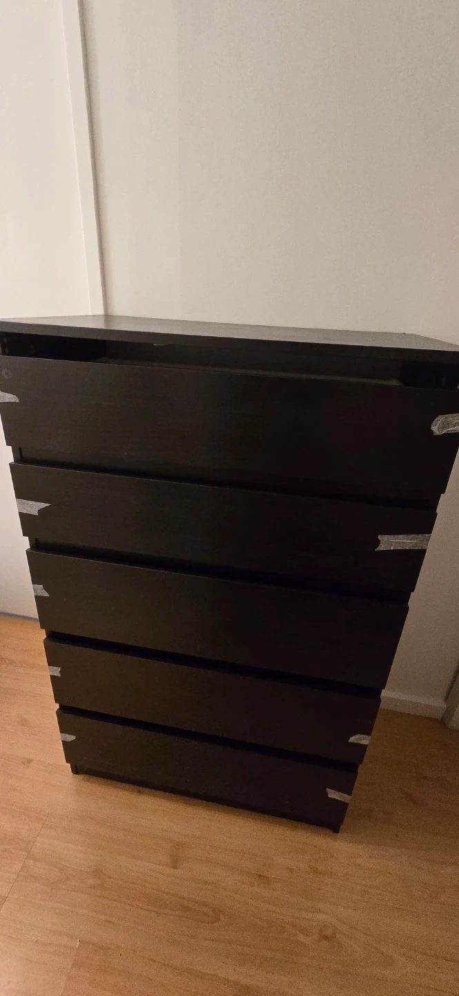 Dark brown 5 - drawer dresser. It's a sturdy piece of furniture with smooth-gliding drawers. Great for organizing clothes or linens.