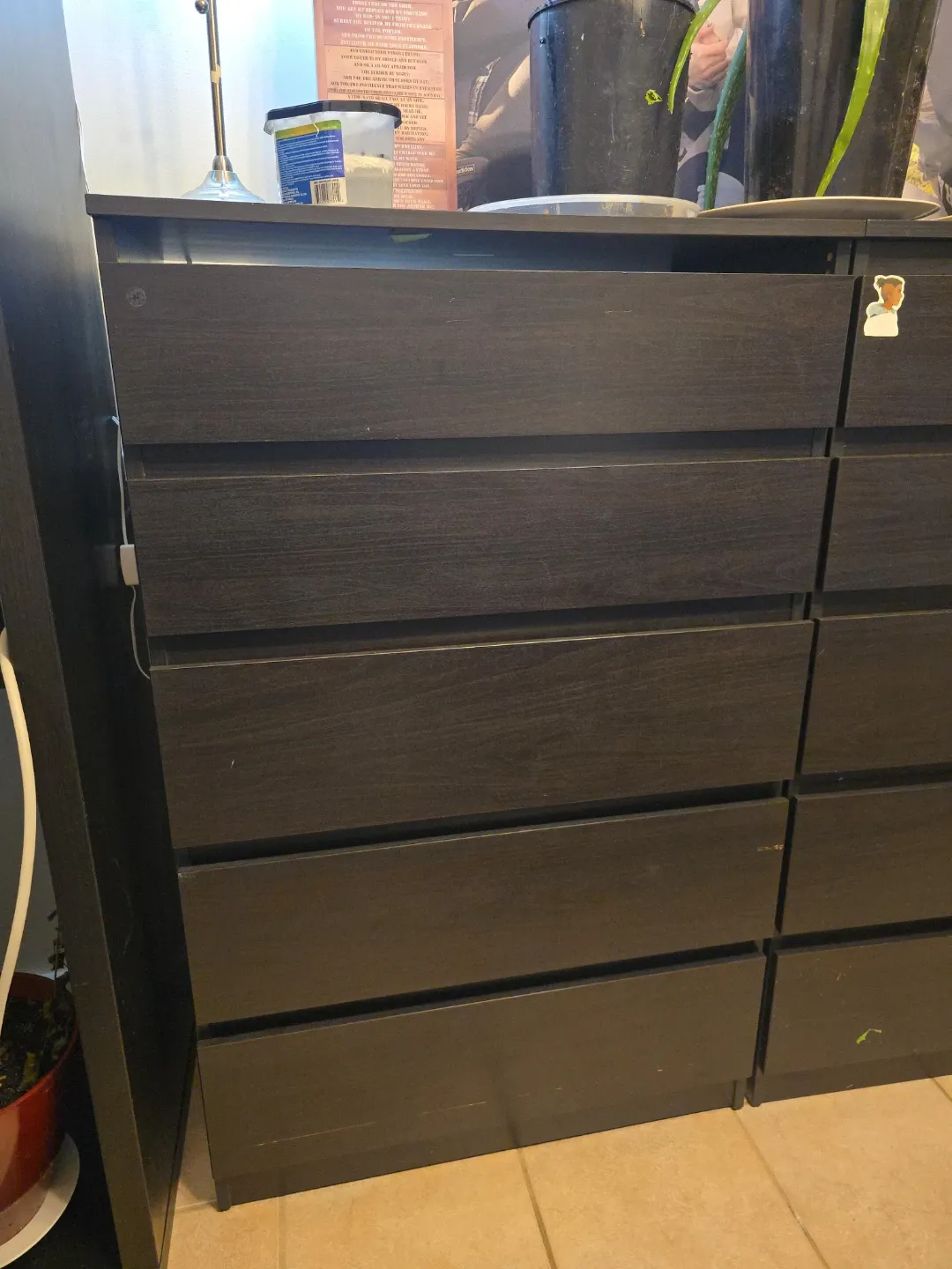 Dark brown 5 - drawer dresser. It's a sturdy piece of furniture with smooth-gliding drawers. Great for organizing clothes or linens.