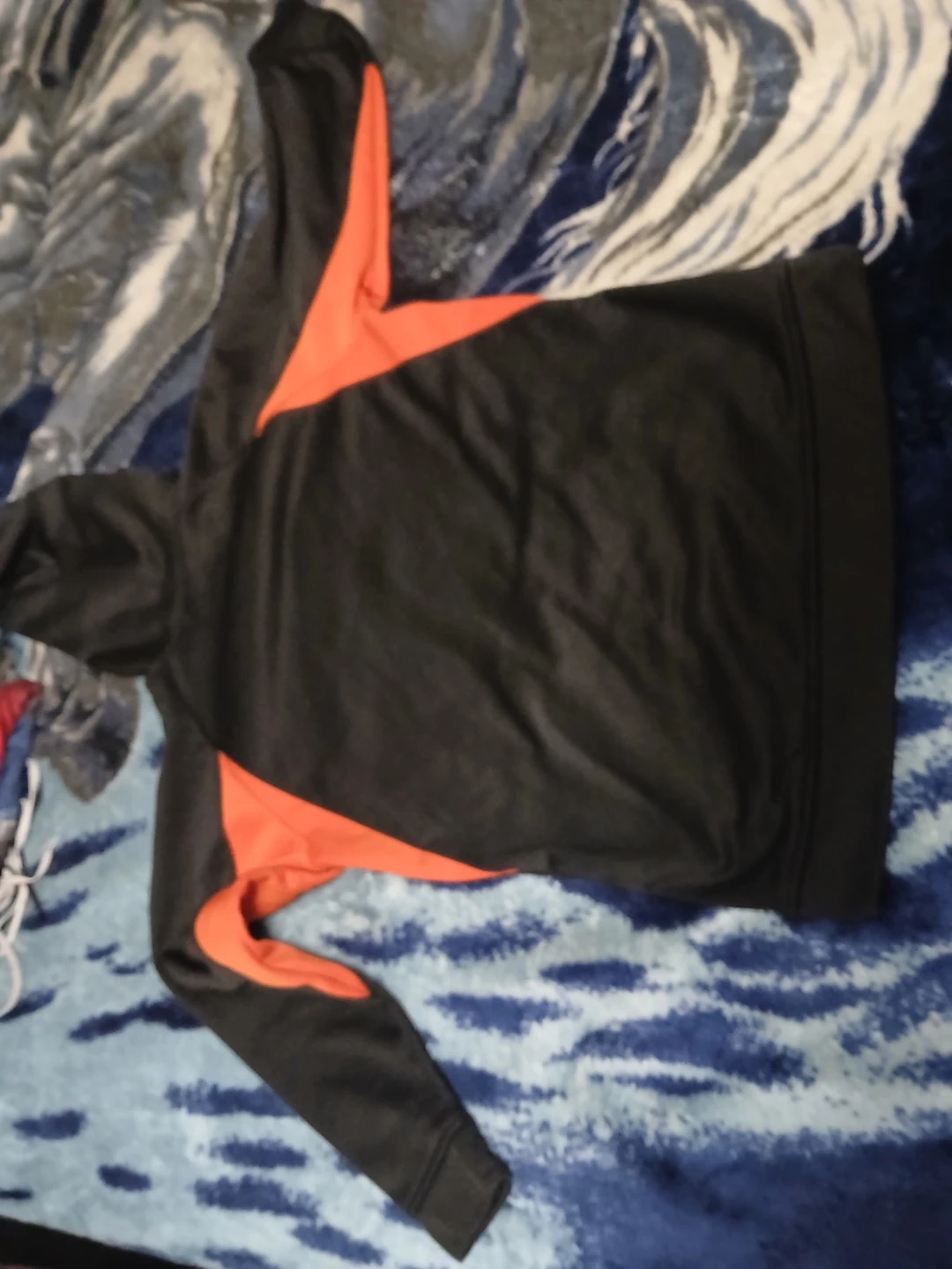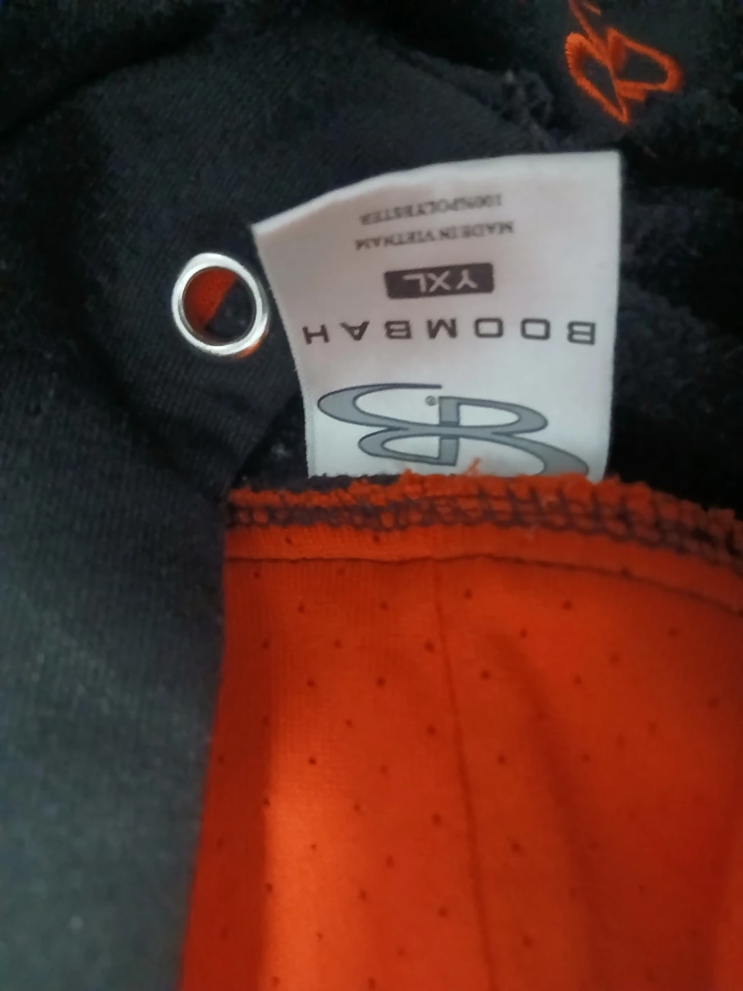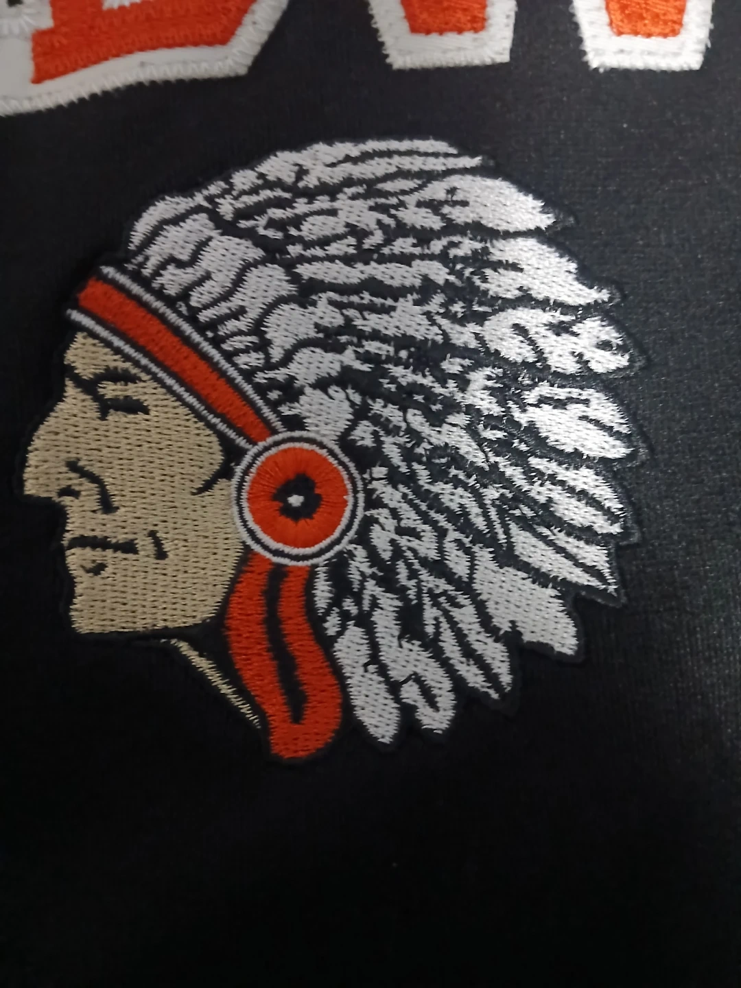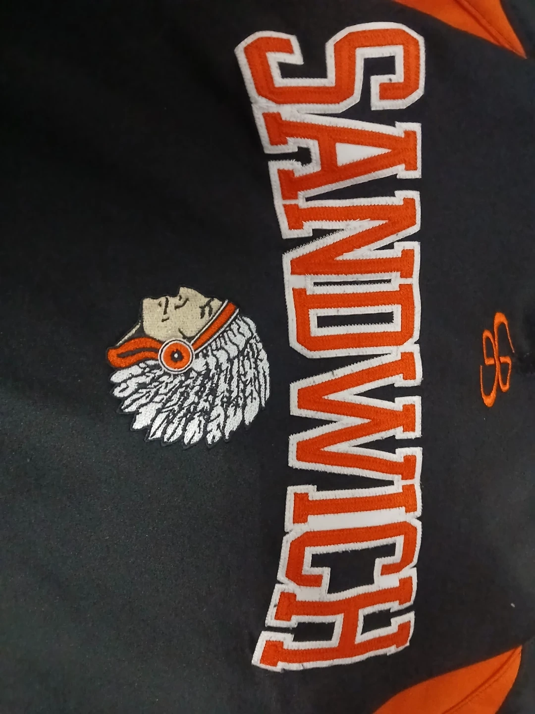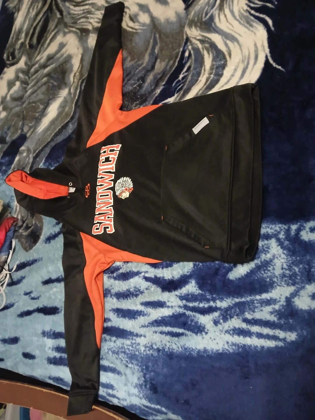 Black hoodie with orange accents and "Sandwich" graphic with Native American chief emblem. 100% polyester material. Made in Vietnam.