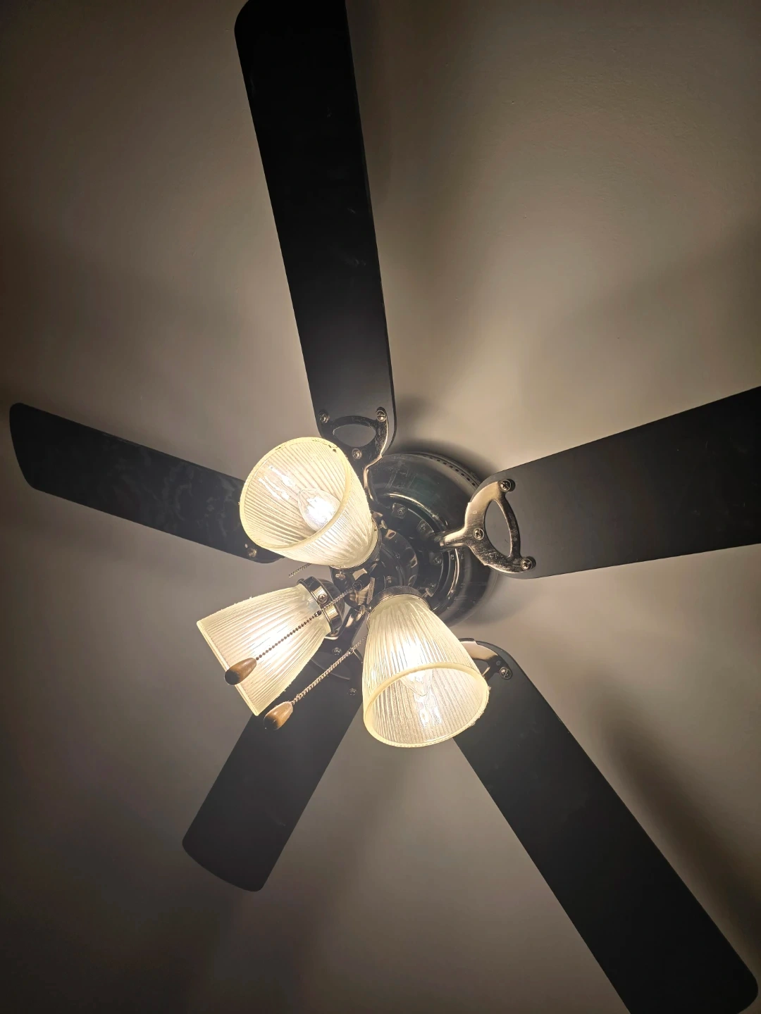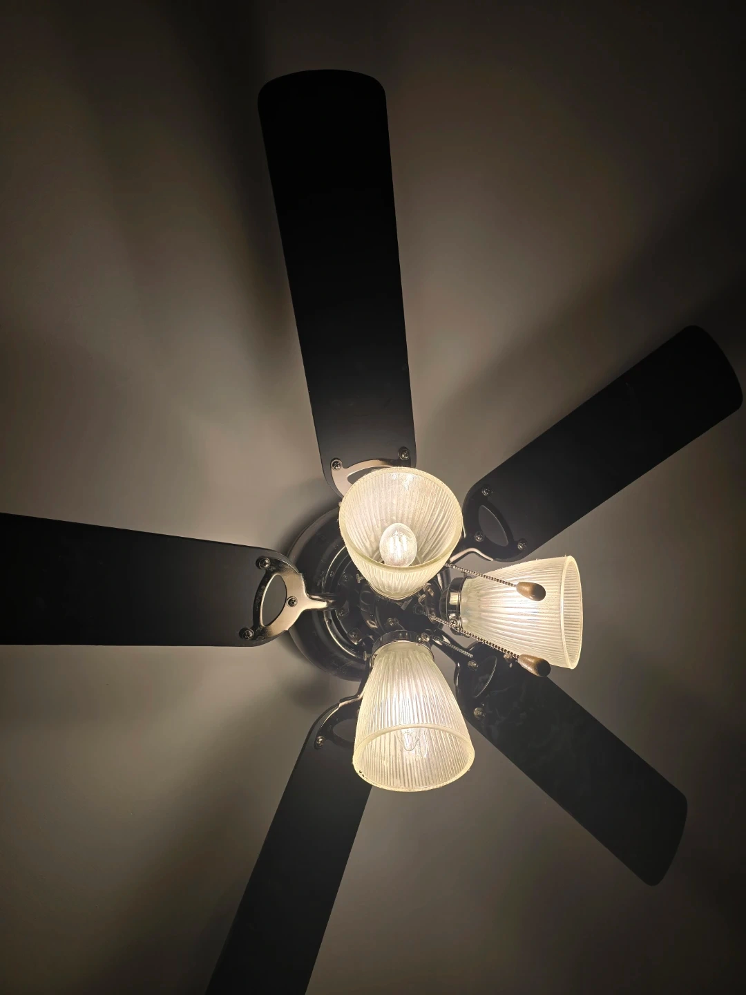 This ceiling fan has five black blades and comes with three light fixtures. The glass shades are ribbed for a textured look. It's a great addition to any room needing air circulation and ambient lighting.