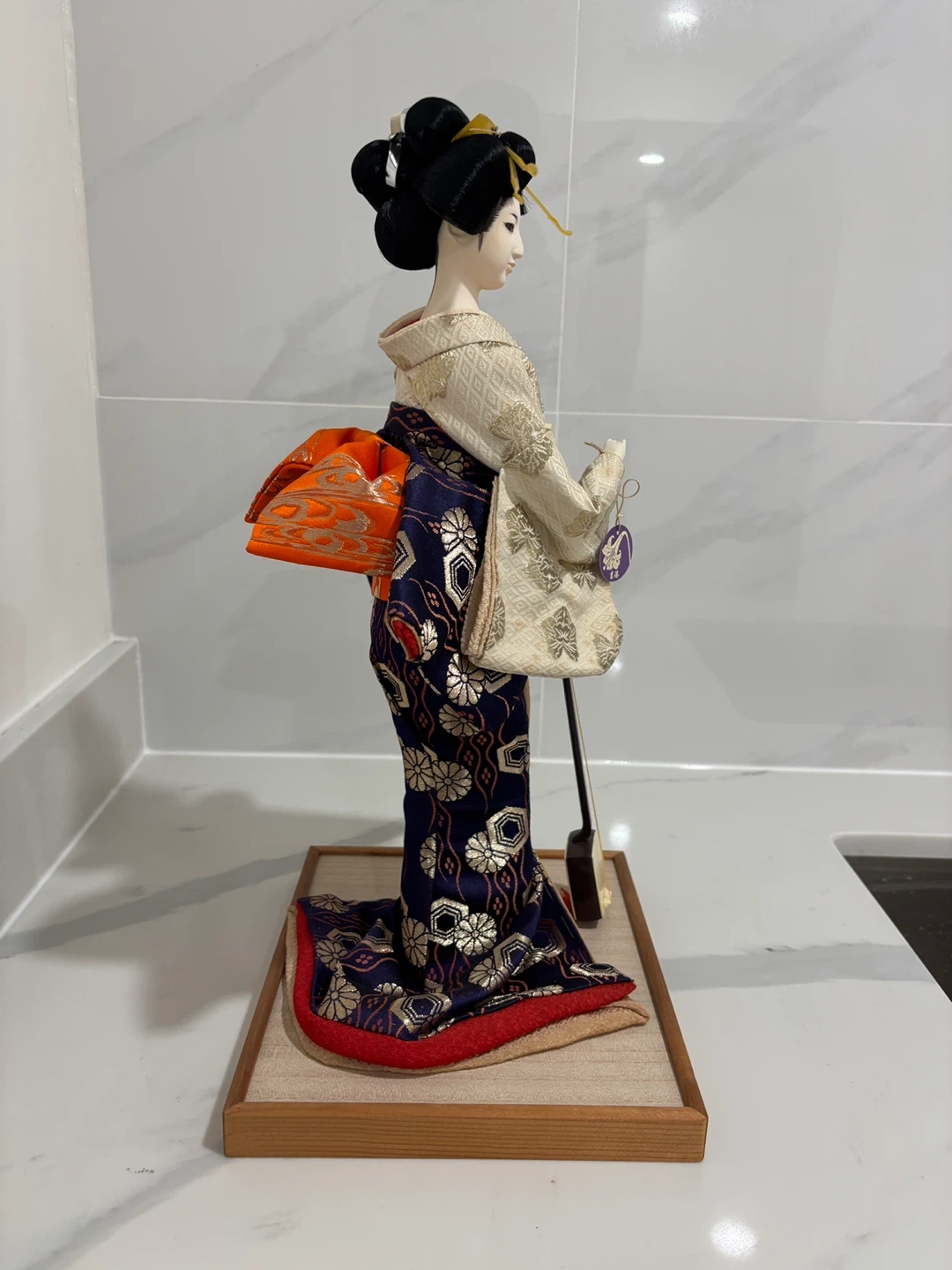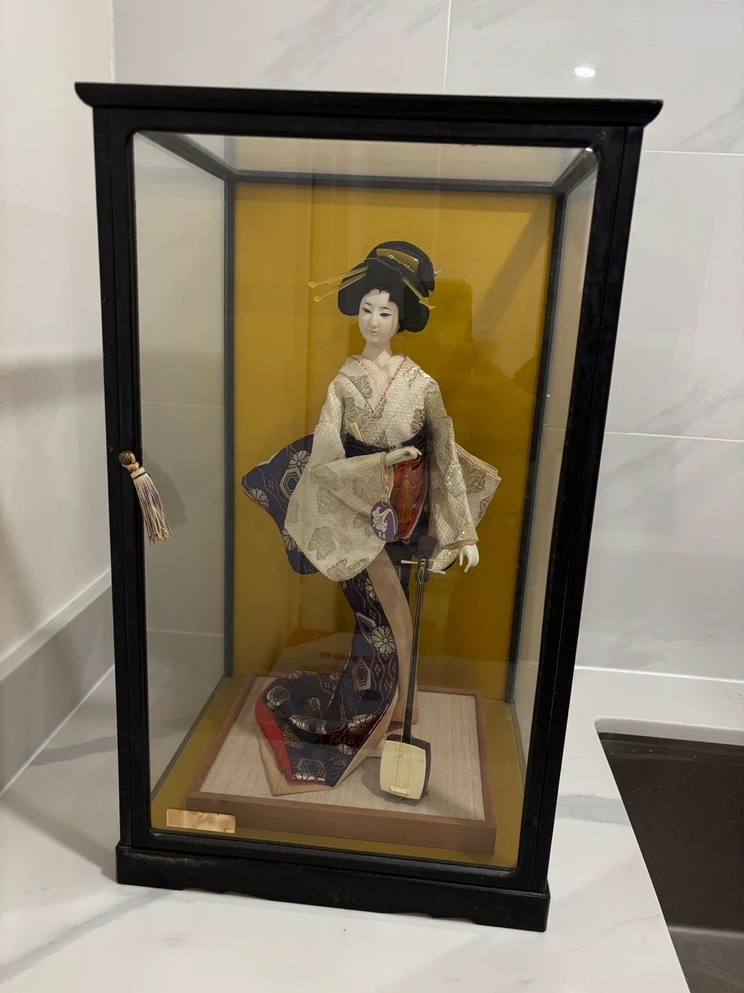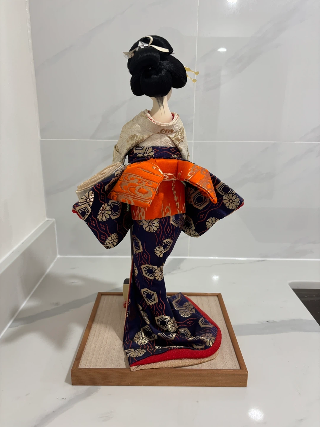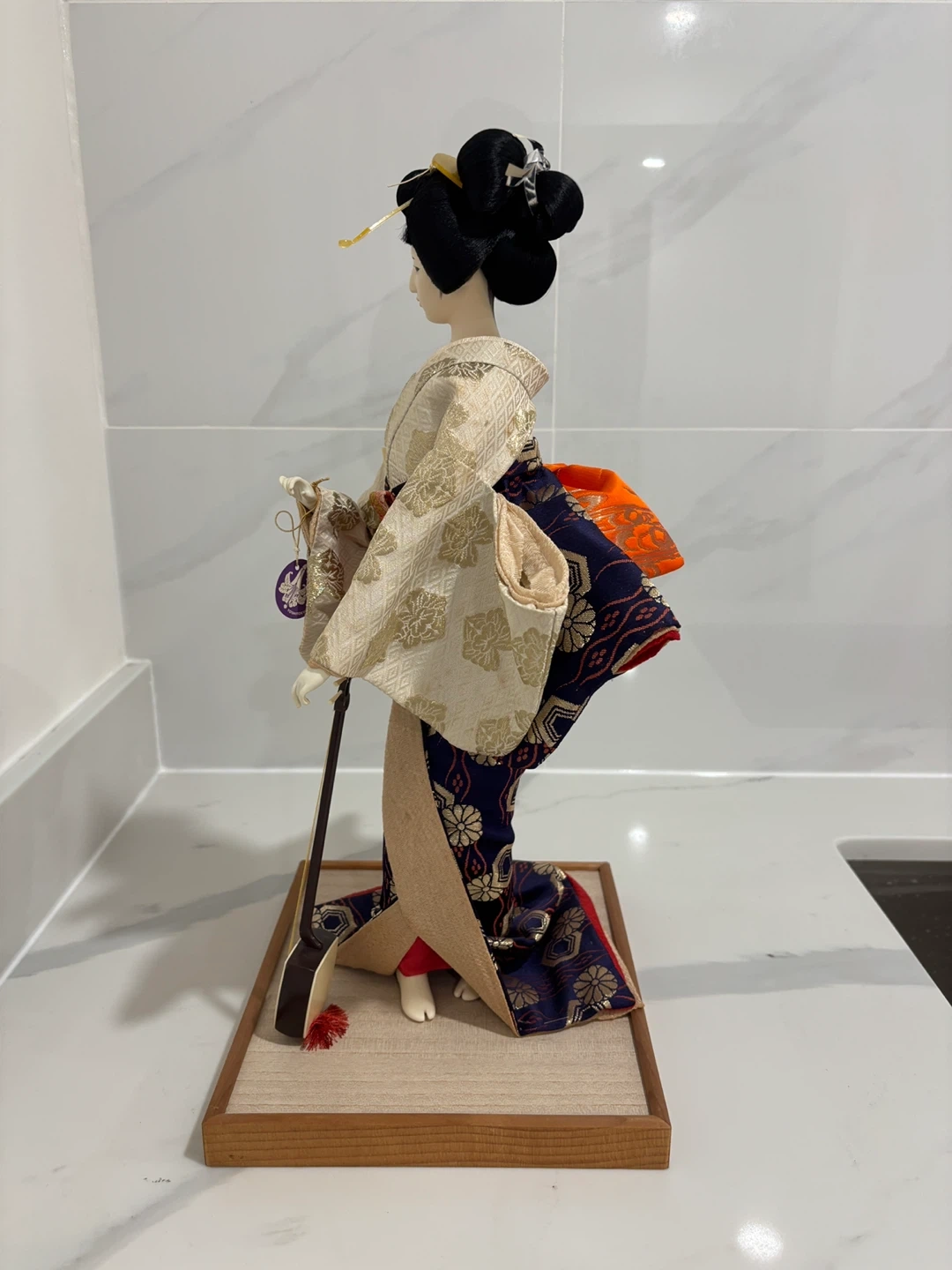 This is a stunning, high-quality collector’s piece featuring a Geisha in a formal pose playing the shamisen. The craftsmanship is exceptional, featuring a hand-painted face, traditional hairstyle with ornate pins, and a multi-layered silk brocade kimono with gold thread accents and a striking orange obi.