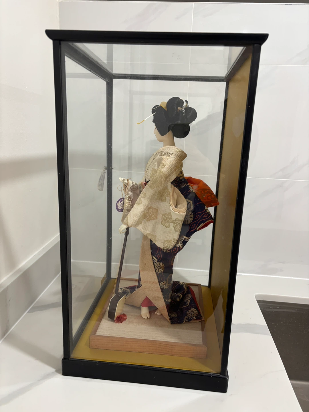 • Display: Housed in a traditional black-framed glass showcase with a gold-tone back panel that beautifully reflects light.