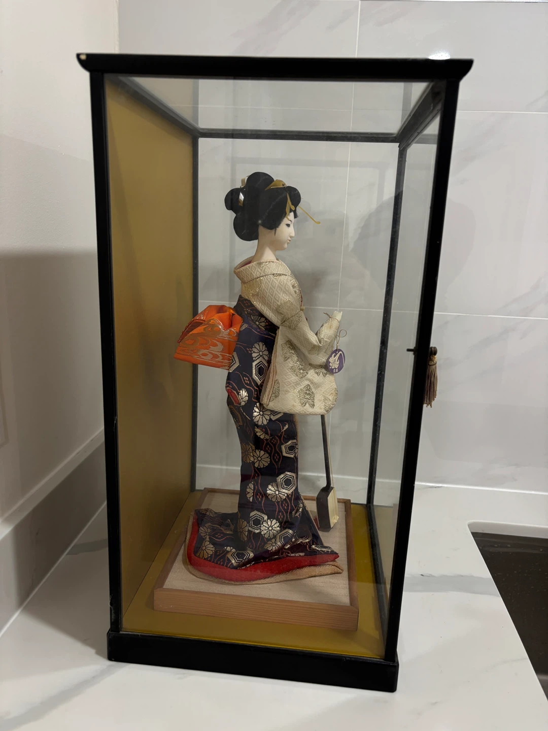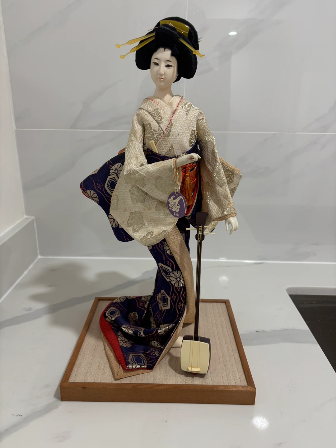 This is a stunning, high-quality collector’s piece featuring a Geisha in a formal pose playing the shamisen. The craftsmanship is exceptional, featuring a hand-painted face, traditional hairstyle with ornate pins, and a multi-layered silk brocade kimono with gold thread accents and a striking orange obi.