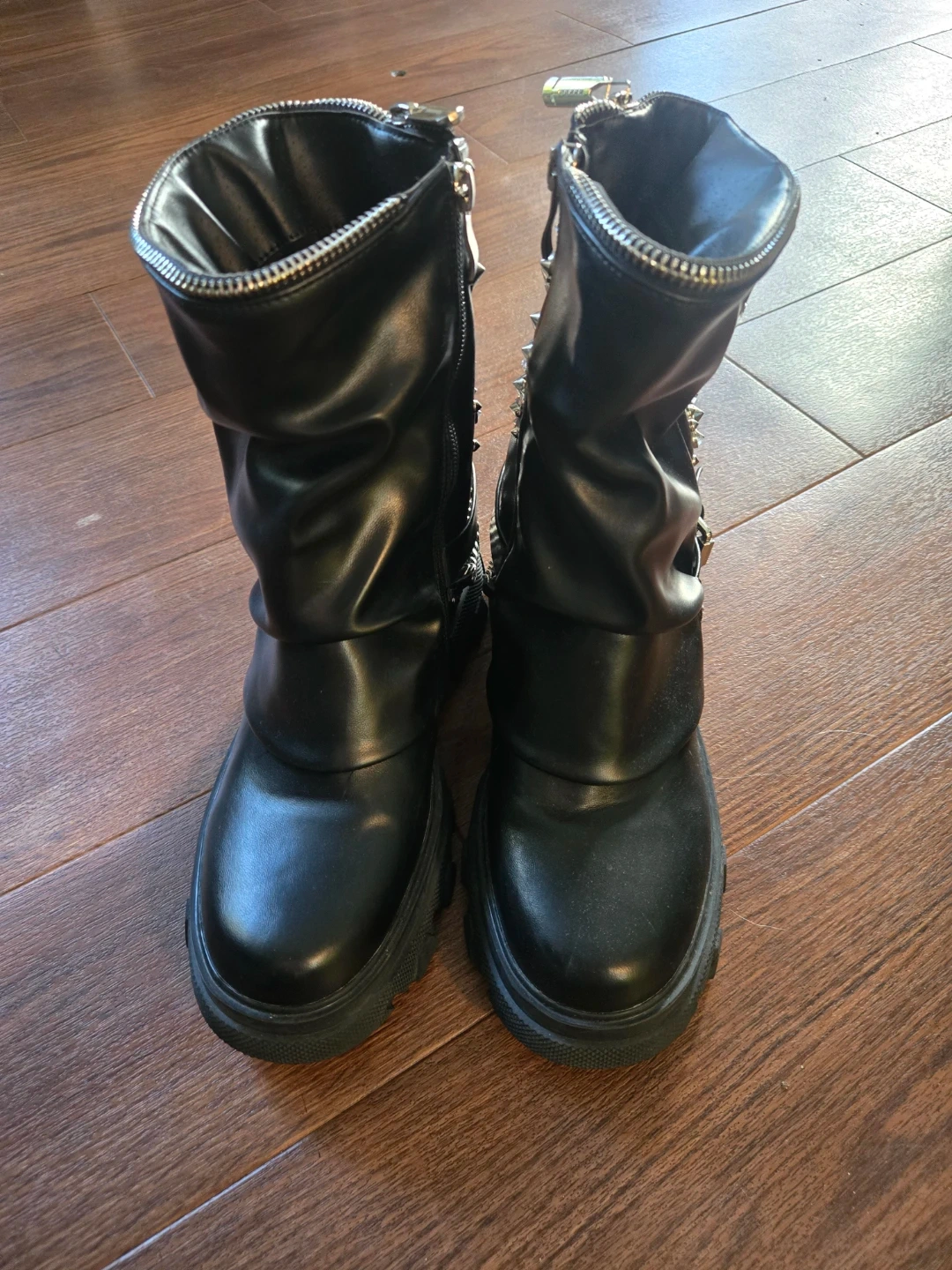 These black platform boots feature an edgy design with multiple studs and a detachable chain accent. They zip up the front for easy wear. It's a statement piece for any outfit! Brand new/never worn paid 200 from dolls kill.