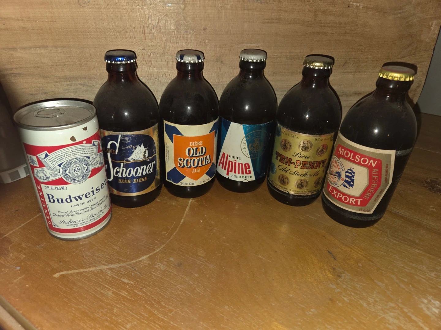 Selling a collection of vintage beer bottles, including brands like Schooner, Old Scotia Ale, Alpine, Ten-Penny Old Stock Ale, and Molson Export. Also included is a Budweiser beer can. Great for collectors or display! Still full