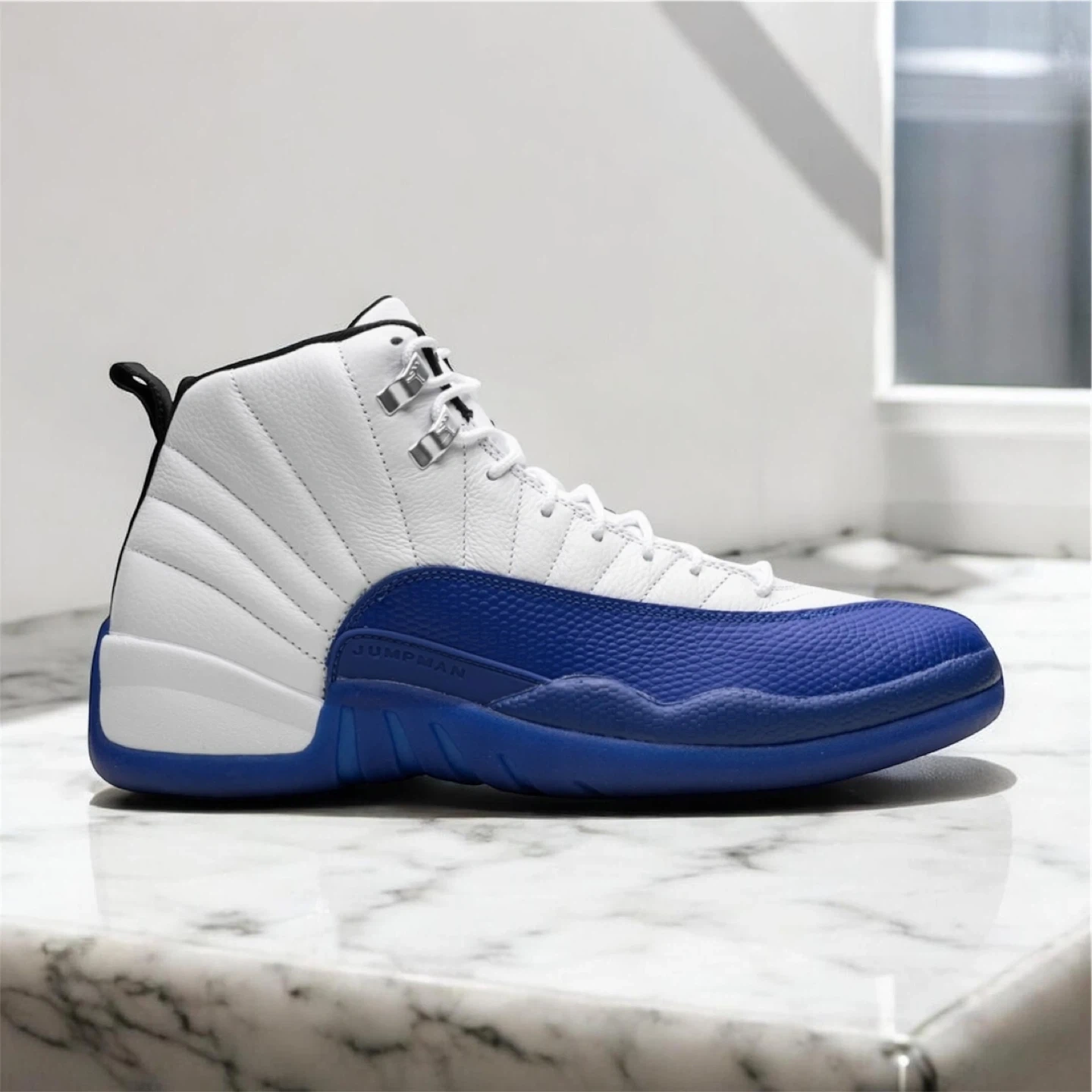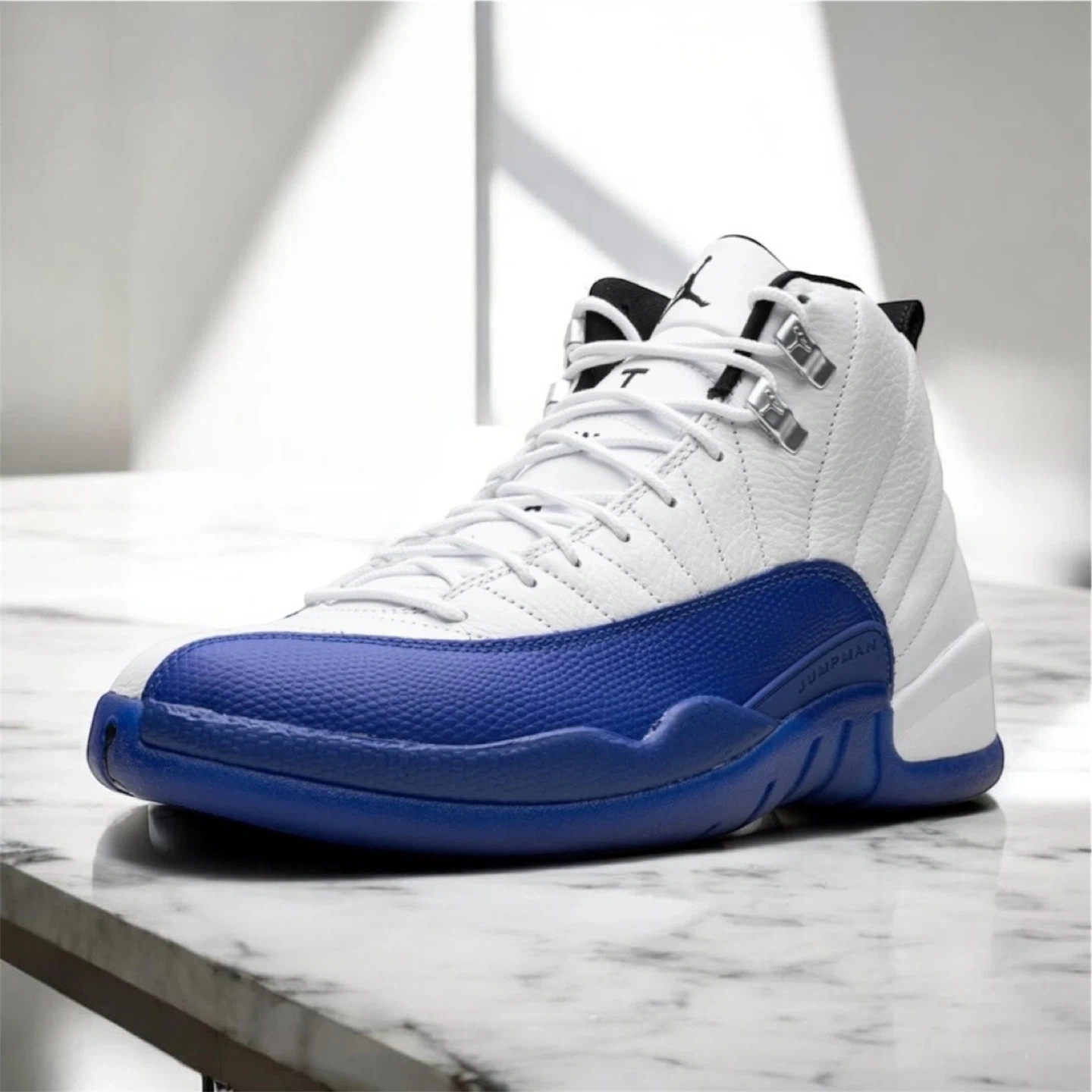 White and royal blue Air Jordan 12 sneakers. Features leather and synthetic materials. Lace-up closure. "Jumpman" branding is visible on the side and "23" on the heel. These iconic kicks are ready for your collection!