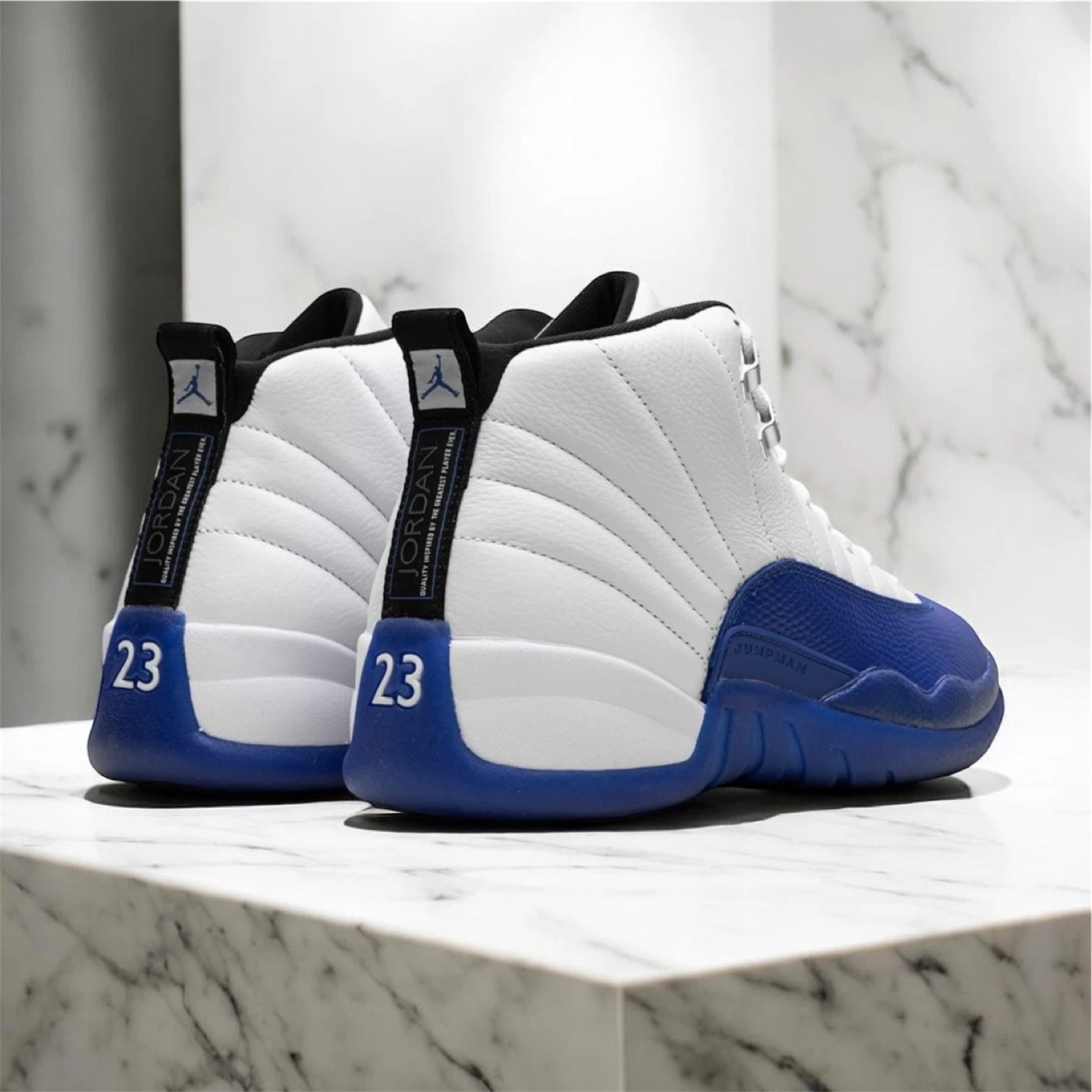 White and royal blue Air Jordan 12 sneakers. Features leather and synthetic materials. Lace-up closure. "Jumpman" branding is visible on the side and "23" on the heel. These iconic kicks are ready for your collection!