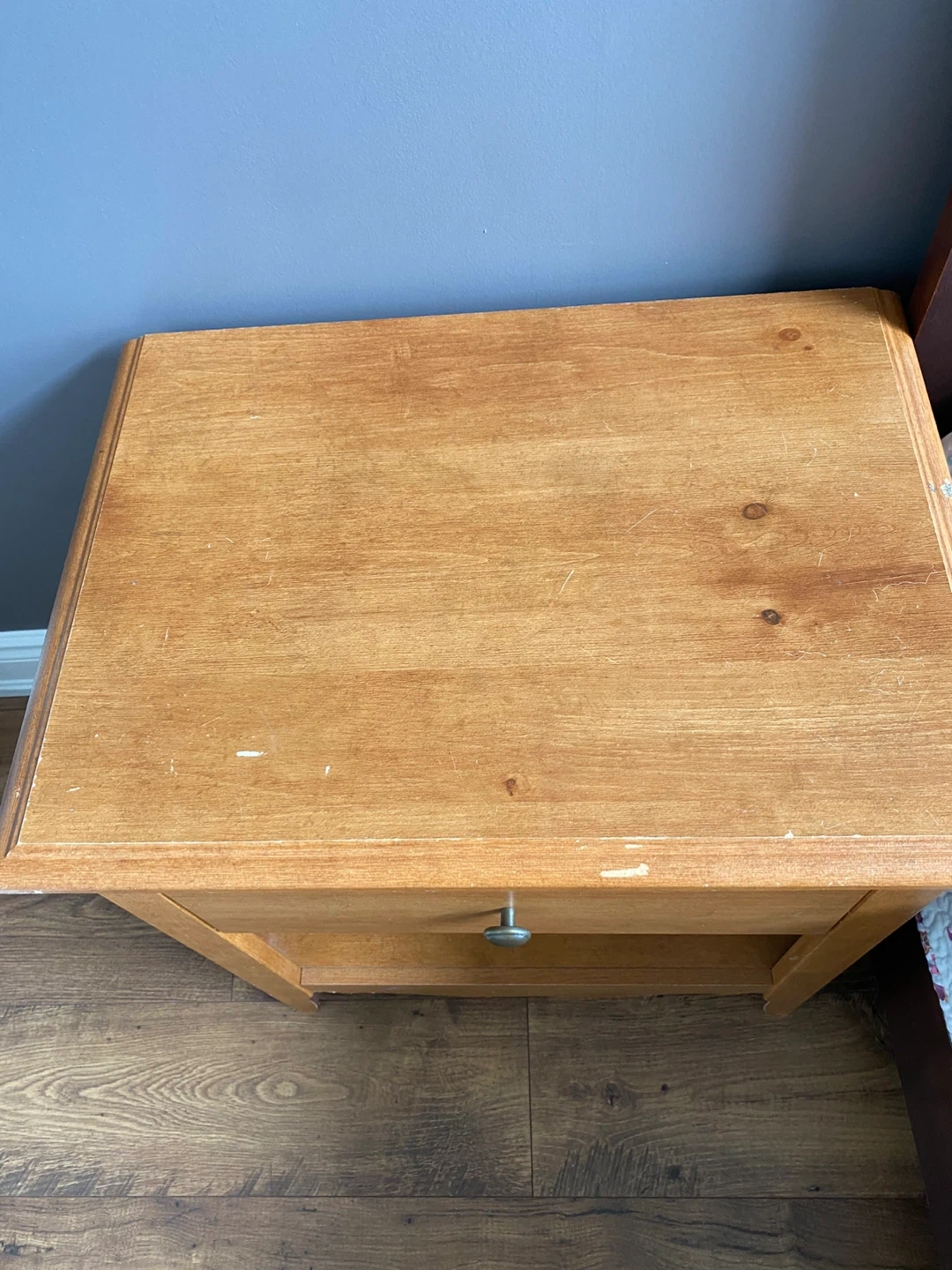This is a simple wooden nightstand. It has one drawer and an open shelf below. It's made of wood and has a light wood finish. Good for storing items beside your bed.