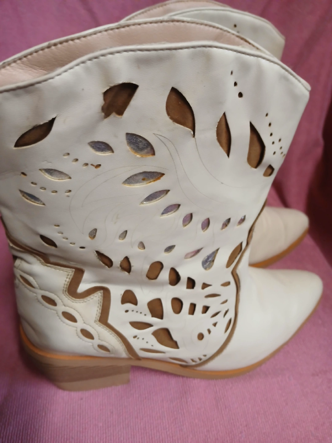 These off white cowboy boots have a unique laser-cut design! They're perfect for adding a touch of western flair to any outfit.