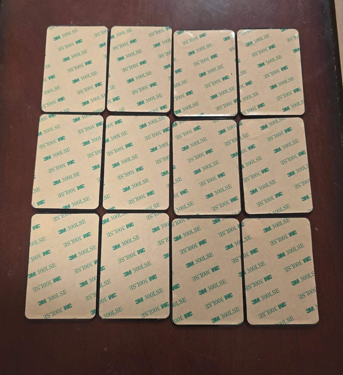 Twelve black card holders featuring the 'prime student' logo. These holders have a stitched edge and a faux leather finish. The back of each holder has a peel-off adhesive backing, labelled '3M 300LSE'.