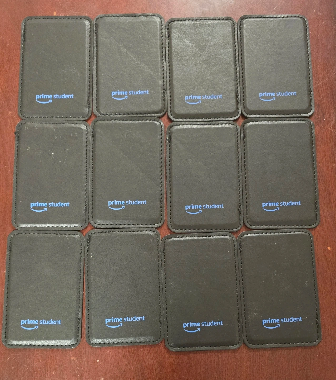 Twelve black card holders featuring the 'prime student' logo. These holders have a stitched edge and a faux leather finish. The back of each holder has a peel-off adhesive backing, labelled '3M 300LSE'.